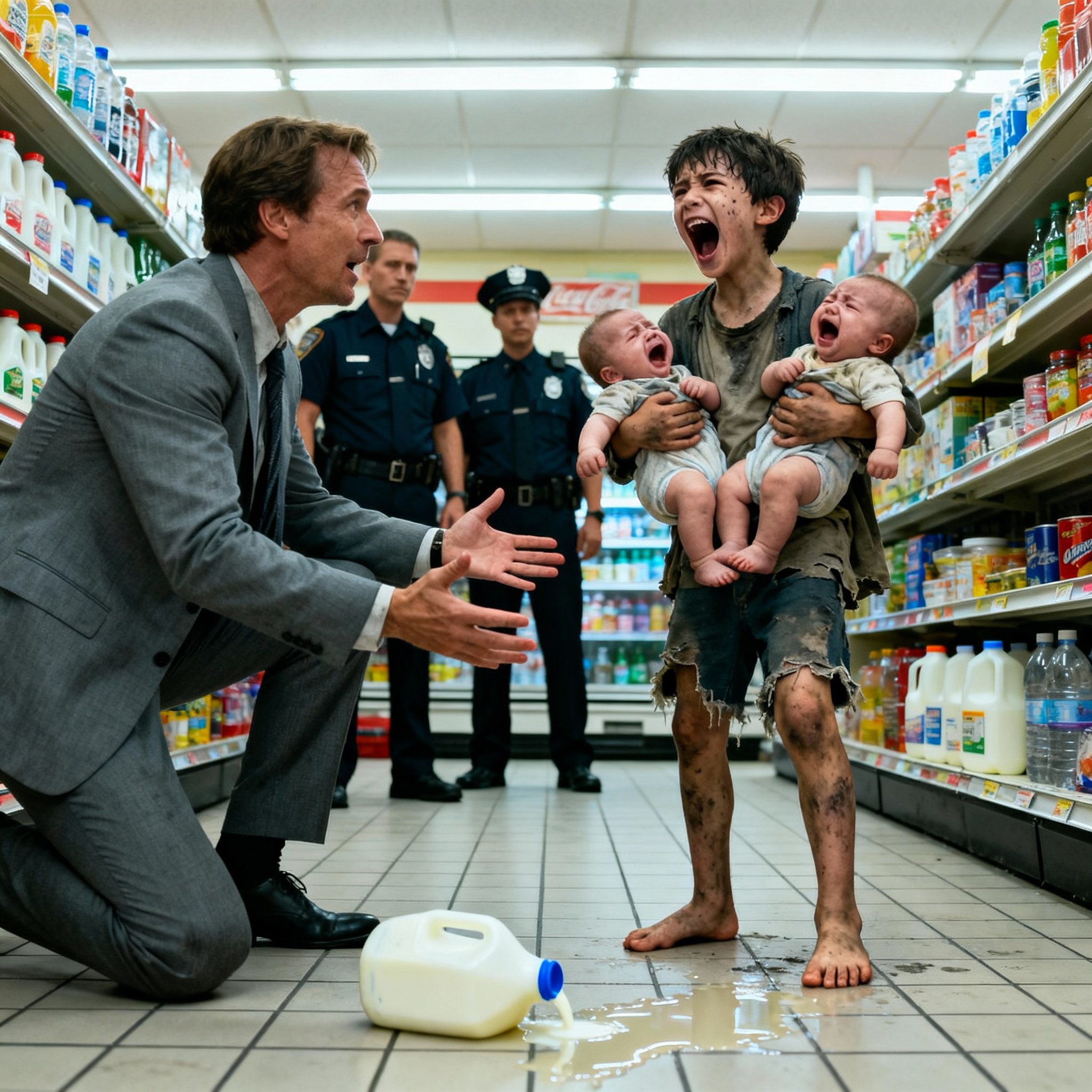 A homeless girl was reported to the police by a store manager for stealing a carton of milk for her two younger siblings, who were crying weakly from hunger; suddenly, a millionaire who witnessed the scene stepped forward.