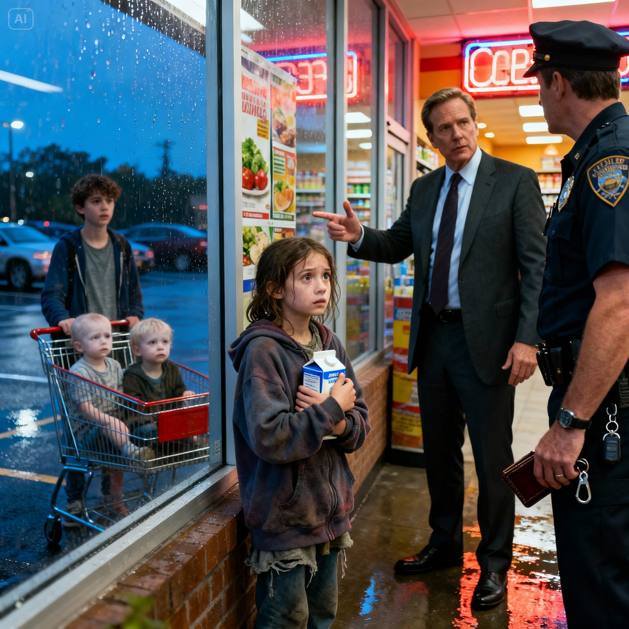 A homeless little girl was reported to the police by a store manager for stealing a box of milk for her two younger siblings, who were crying weakly from hunger — suddenly, a millionaire who witnessed the scene stepped forward…
