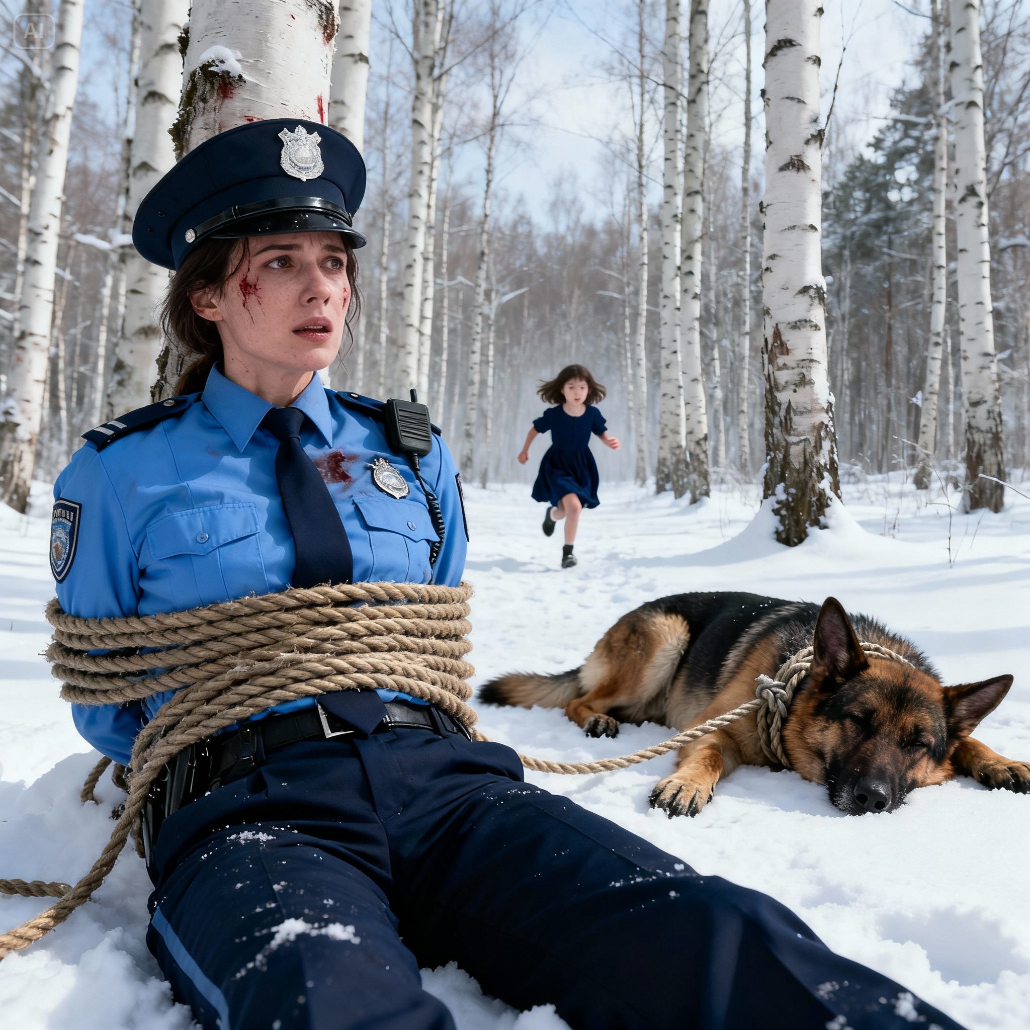 She lay half-buried in the snow, face up, her uniform torn and her hands bound with a rough rope that cut into her wrists. Each breath came out in a wisp of water, growing weaker and smaller with each breath. The cold bit at her skin, but the pain in her side reminded her that she was still alive.