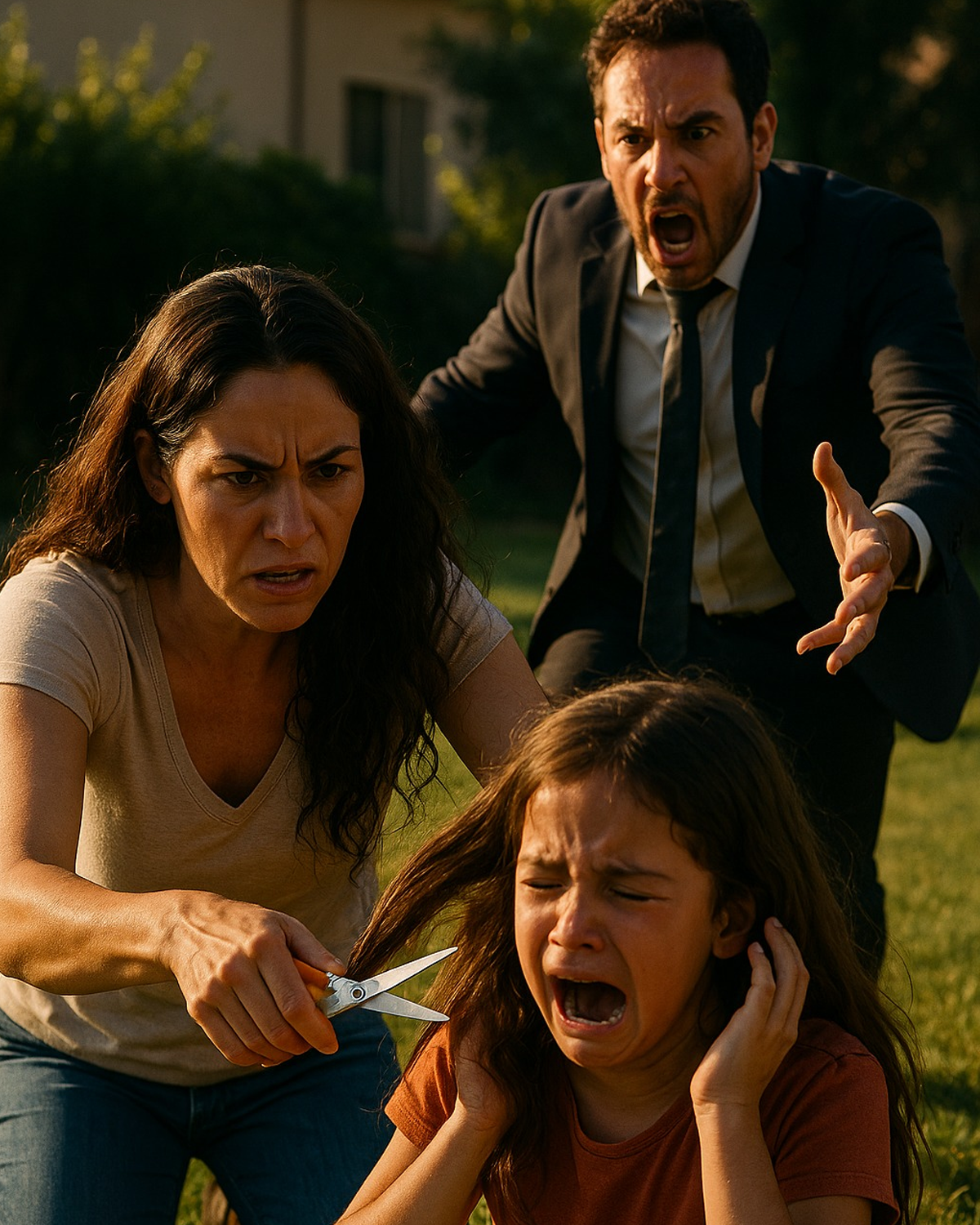 Alejandro didn’t let her finish. With firm steps he approached, snatched the scissors from her hand, and threw them far away, against the terrace floor. Then he lifted Lucía in his arms: the little girl’s small body was still trembling with fear.