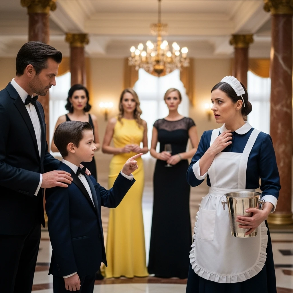 There were magazine-worthy blondes, brunettes with intense gazes, and women in dresses so tight they looked like they couldn’t breathe. Most of the guests turned to look at them, some discreetly, others without shame. Mauricio expected the boy to point at one of them playfully, but what happened left him speechless. Emiliano didn’t look at any of the models; instead, he pointed with his little finger toward a corner of the room, right where a young woman was crouching. She was cleaning the floor with a rag, wearing a light gray uniform, her hair tied back, and without a drop of makeup.