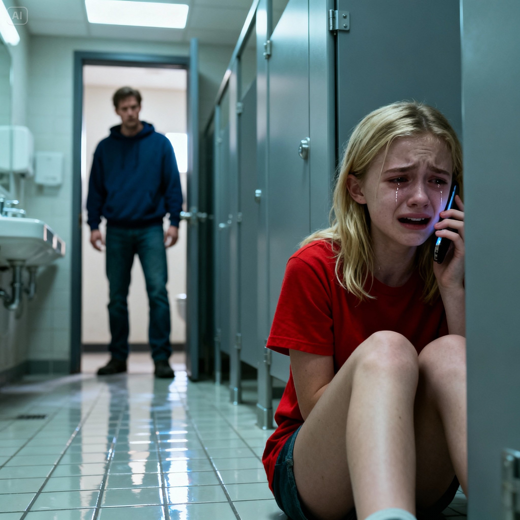 Behind the farthest stall door, Lily was curled up, crying. An officer gently opened it, crouching down. “You’re safe now, sweetheart,” he whispered.