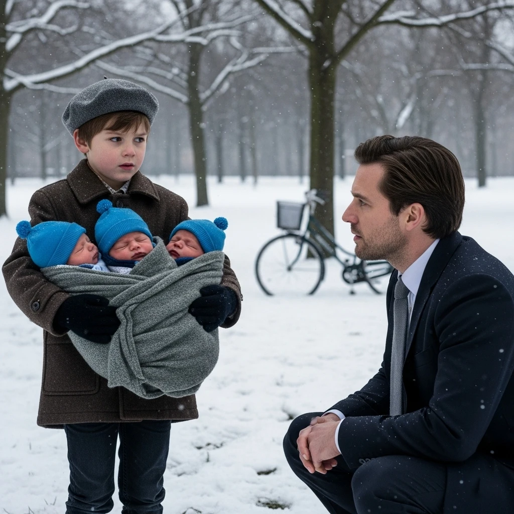 Snow fell heavily from the sky, covering the park in a thick white blanket. The trees remained silent. The playground swings swayed a little in the cold wind, but there was no one to play on. The entire park felt empty and forgotten. Through the falling snow, a small boy appeared. He couldn’t have been more than seven years old. His jacket was thin and torn. His shoes were wet and full of holes. But he didn’t mind the cold. In his arms, he carried three tiny babies wrapped tightly in old, worn blankets.