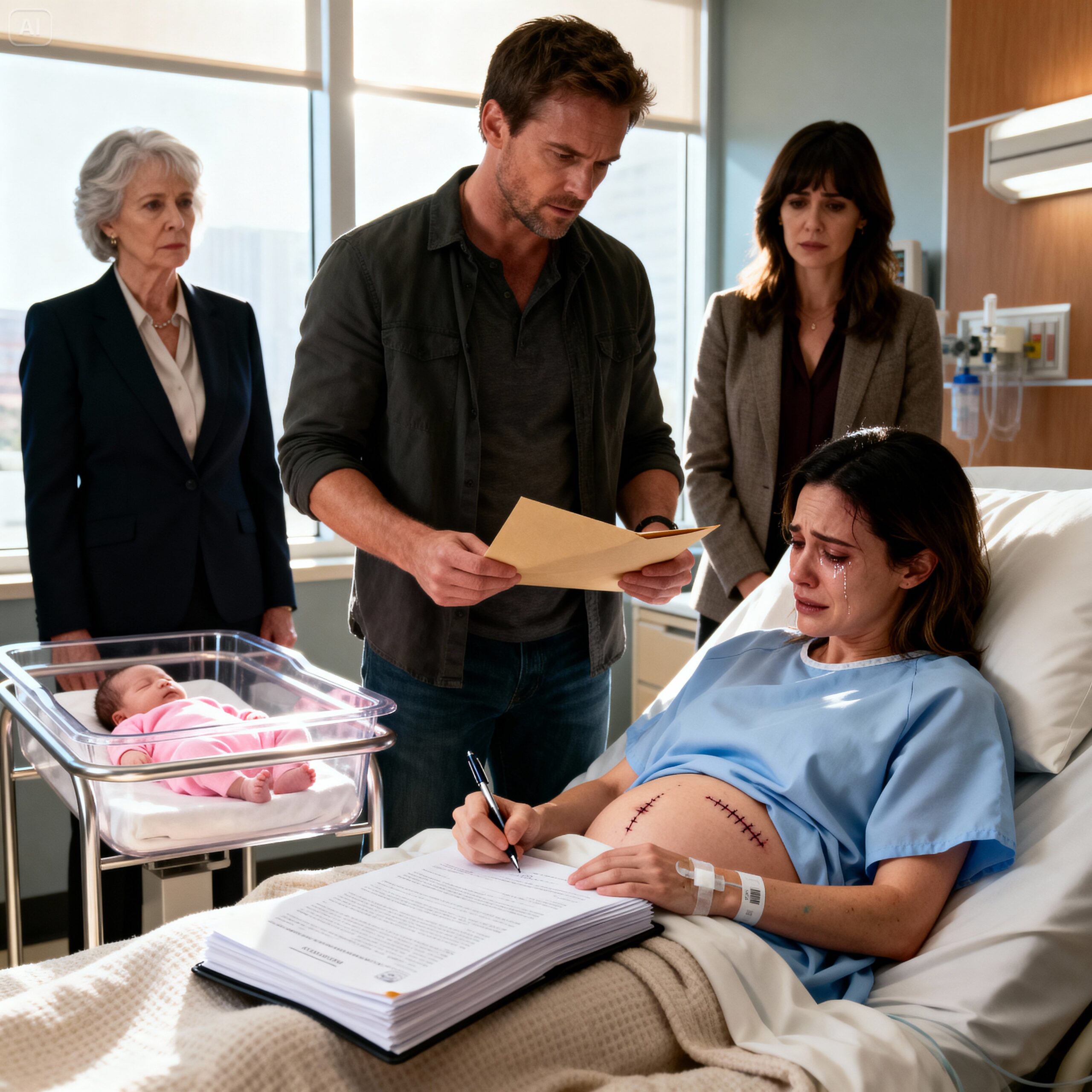 He reached into his briefcase and pulled out a thick, blue legal folder. He tossed it onto my chest. It landed with a heavy thud, pressing against my surgical incision. I gasped in pain.