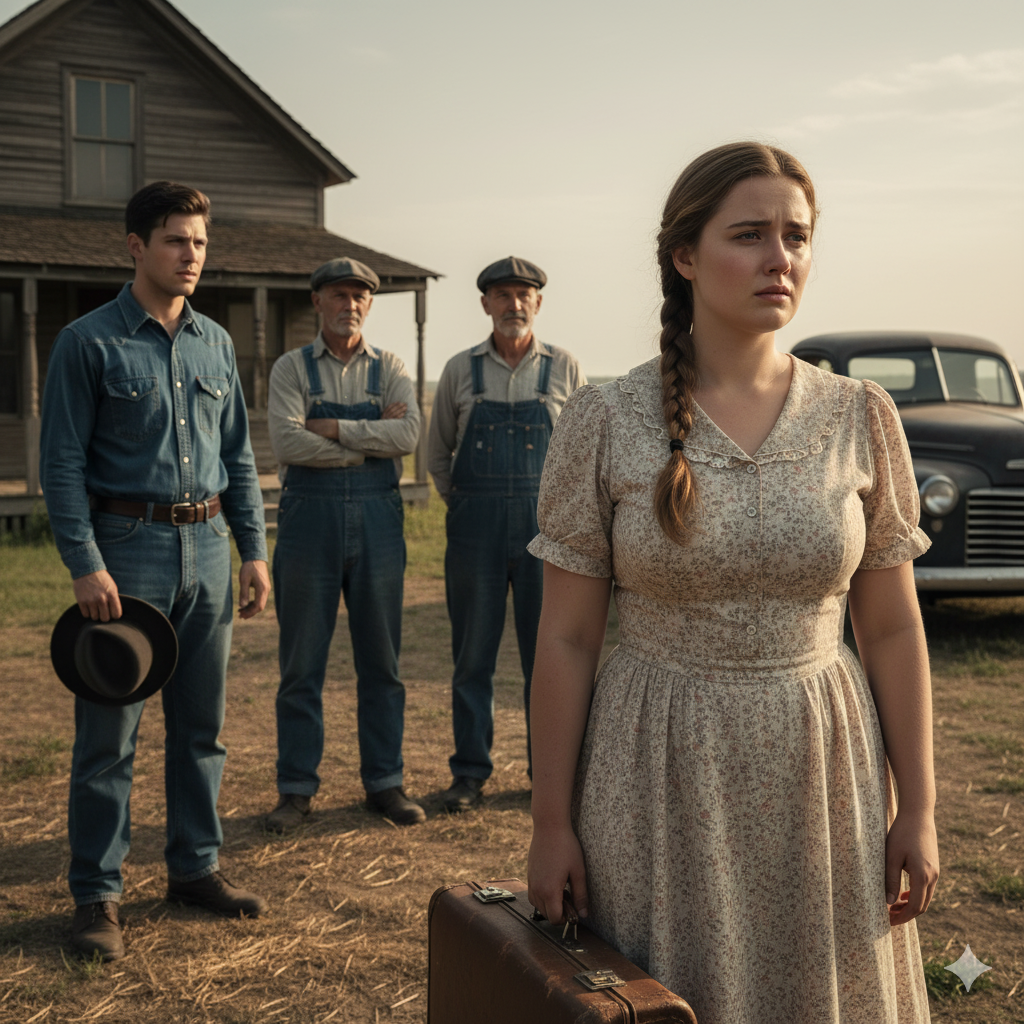 The dust swirled around the worn wheels of the old Chevrolet truck as it pulled up to the modest farmhouse in the late afternoon sun. 24-year-old Margaret sat in the passenger seat, her hands trembling as she clutched her battered leather suitcase. Her long blonde hair was braided simply, and her floral dress, though clean and carefully mended, showed signs of years of wear.