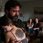 When I went to my ex-wife’s house to pick up our daughter, I noticed red marks on her back. Her new boyfriend just laughed and said, “They’re just little marks.” I smiled and replied, “Thank you… that helps me more than you think.” The girl didn’t want to take off her hoodie, but my ex ended up lifting the garment. Then I saw it: a massive mandala tattooed on her back. “She said she wanted to look strong, like in the movies,” my ex commented as if it were no big deal. But what happened next… was something I never imagined.