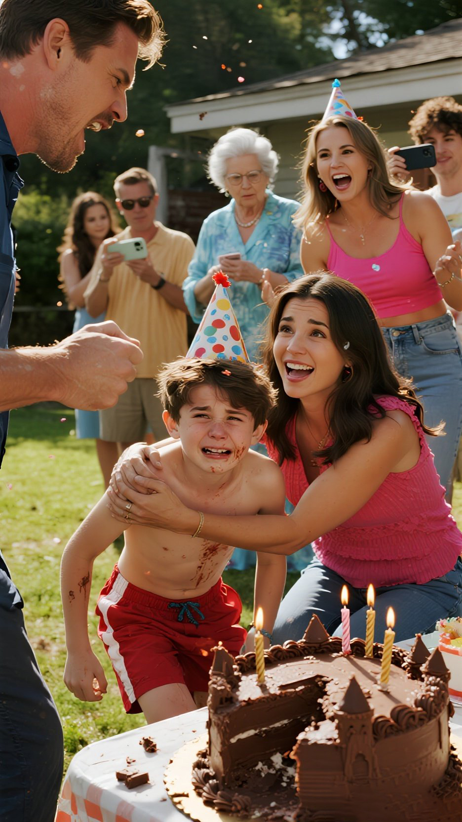 The party had turned into a disaster. Parents who had just arrived to pick up their kids stood frozen, witnessing the entire, horrifying scene. No one cared about the ruined cake anymore. All I could think about was how to protect my son from any more pain. He was still trembling in Taylor’s arms, his small face a mess of tears and chocolate. This was not the birthday he had dreamed of.