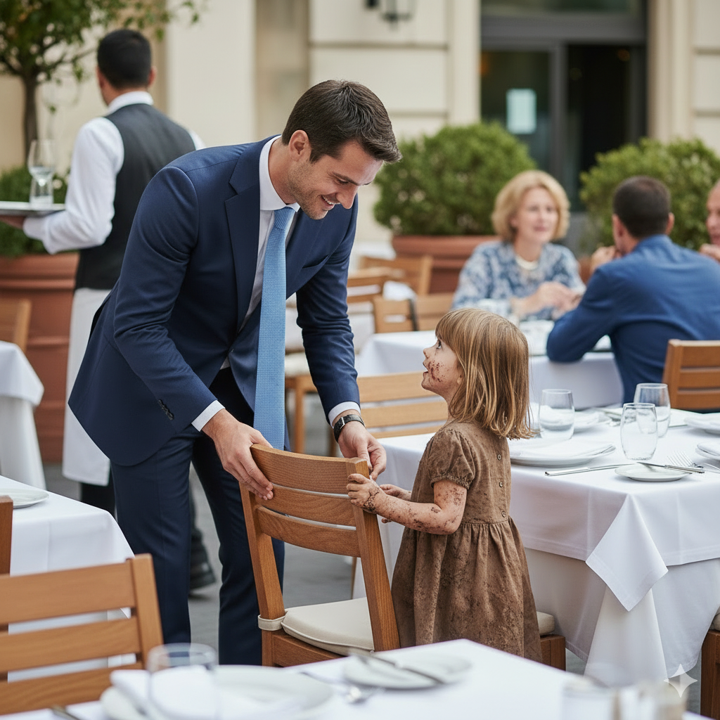 The little girl’s small, fragile figure seemed wildly out of place against the black tablecloths and glittering chandeliers. Can I eat with you? The waiter froze mid-step. A hush fell over the patio.