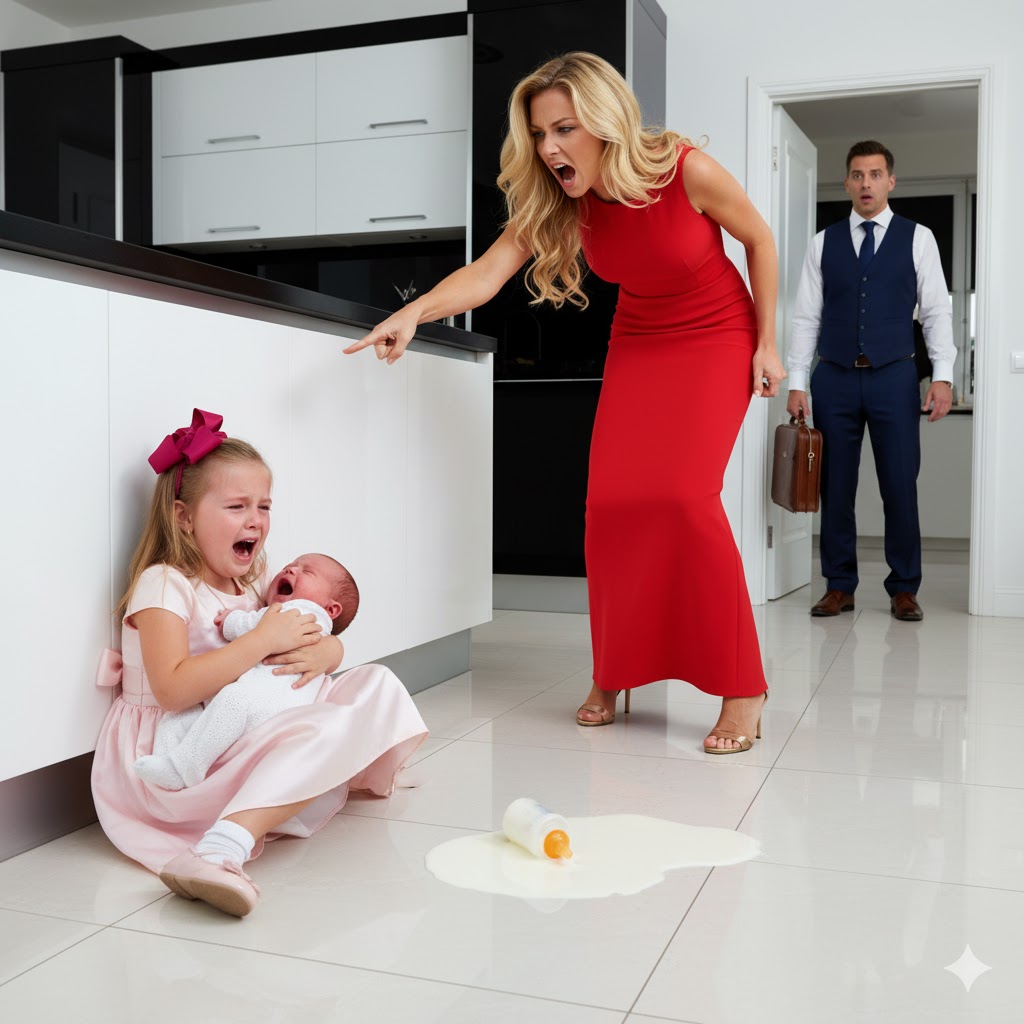 The trembling voice of a little girl echoed through the vast marble kitchen of a suburban mansion in California. Six-year-old Lily Carter was clutching her baby brother, Noah, to her chest, tears running down her cheeks as milk spread across the floor. The glass bottle had slipped from her tiny hands — just an accident. But for her stepmother, Clara, it was enough to ignite her fury.