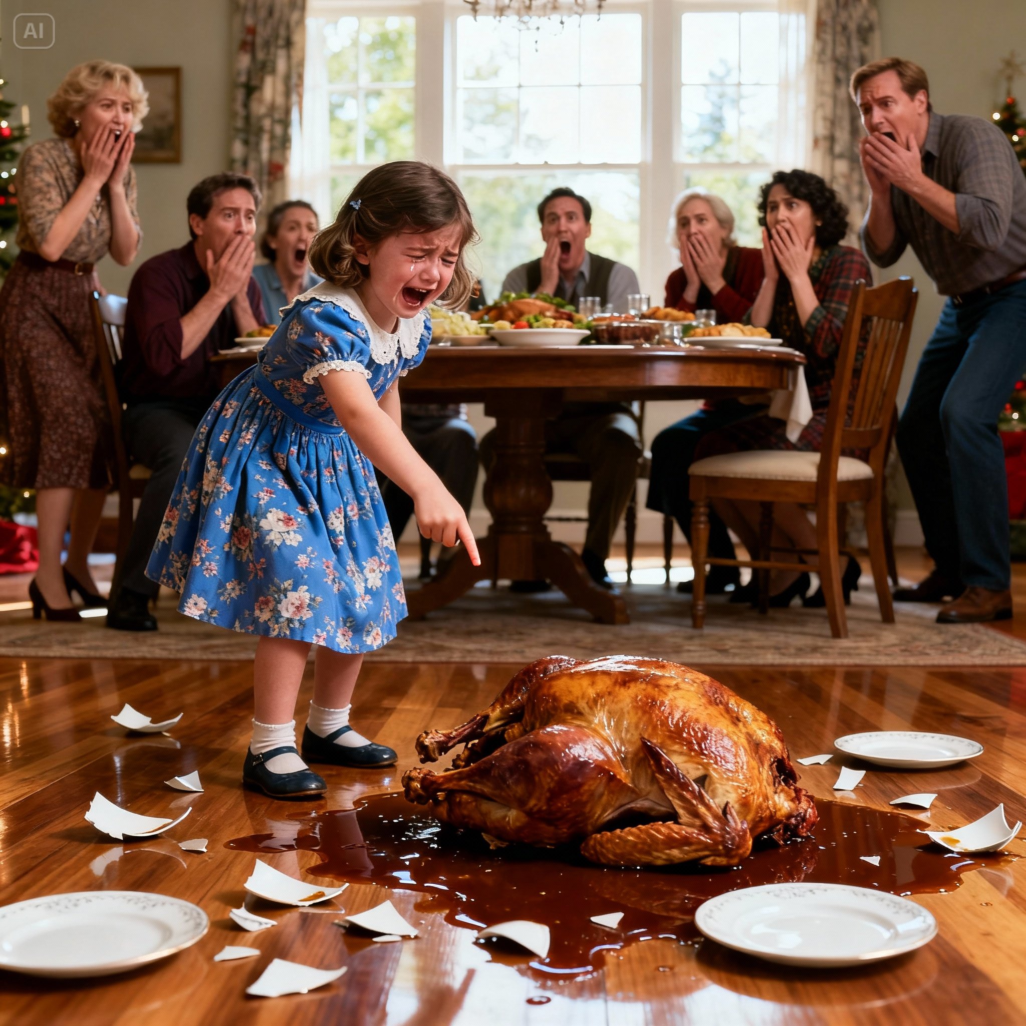 During Thanksgiving dinner, my five-year-old daughter suddenly shouted, ran to the table, and tossed the whole turkey onto the floor. Everyone went silent. I crouched down and asked as gently as I could, “Sweetheart, why did you do that?” She caught her breath, raising her hands triumphantly. “Because I saved all of you!” No one knew what she meant… not until she whispered something that froze the entire room…