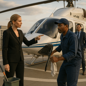 The janitor adjusted his headset, muttered a call sign into the radio, and glanced toward the stunned CEO standing frozen by the helipad rail.
