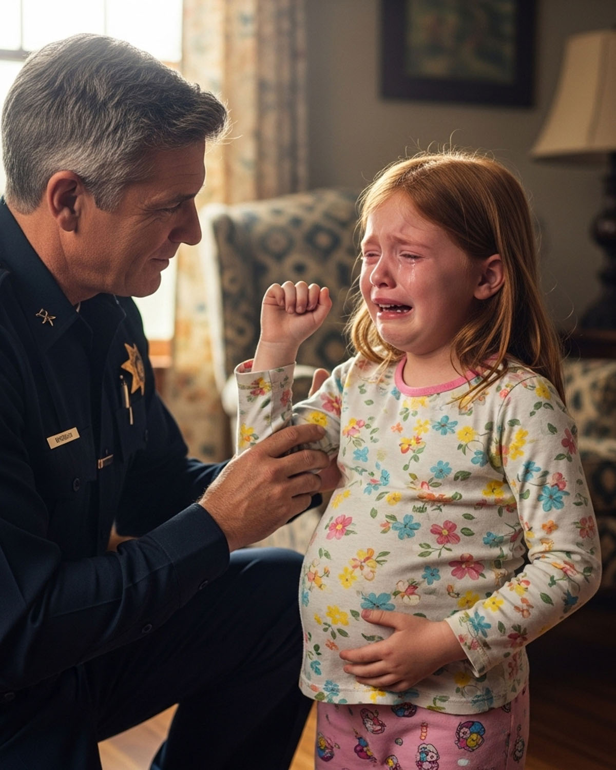 But what alarmed him most was her swollen abdomen, still visible beneath her worn blue T-shirt. Hello, Liliana. I’m Officer Lopez. He knelt down to her level. “Can you show me what’s bothering you?” Liliana lifted her T-shirt just enough to show her swollen belly, the stretched skin. “It was Dad and his friend,” she whispered, tears in her eyes. “They did this to me.” As Officer Lopez called for an ambulance, neither he nor Liliana noticed the elderly neighbor peering behind the lace curtains across the street.