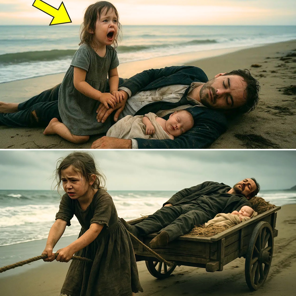 Anna’s arms ached from pulling, but she didn’t dare stop. The wagon creaked. The rusted wheels clattered against shells and broken wood as she dragged the unconscious man up the dune path. The baby lay swaddled in a damp towel beside him, unmoving, silent. Every few steps, she looked down, hoping for some flicker of life. None came. Her chest felt tight. She told herself she was only moving them to get them off the beach, away from the tide. That was all. But a small, stubborn voice inside whispered something else.