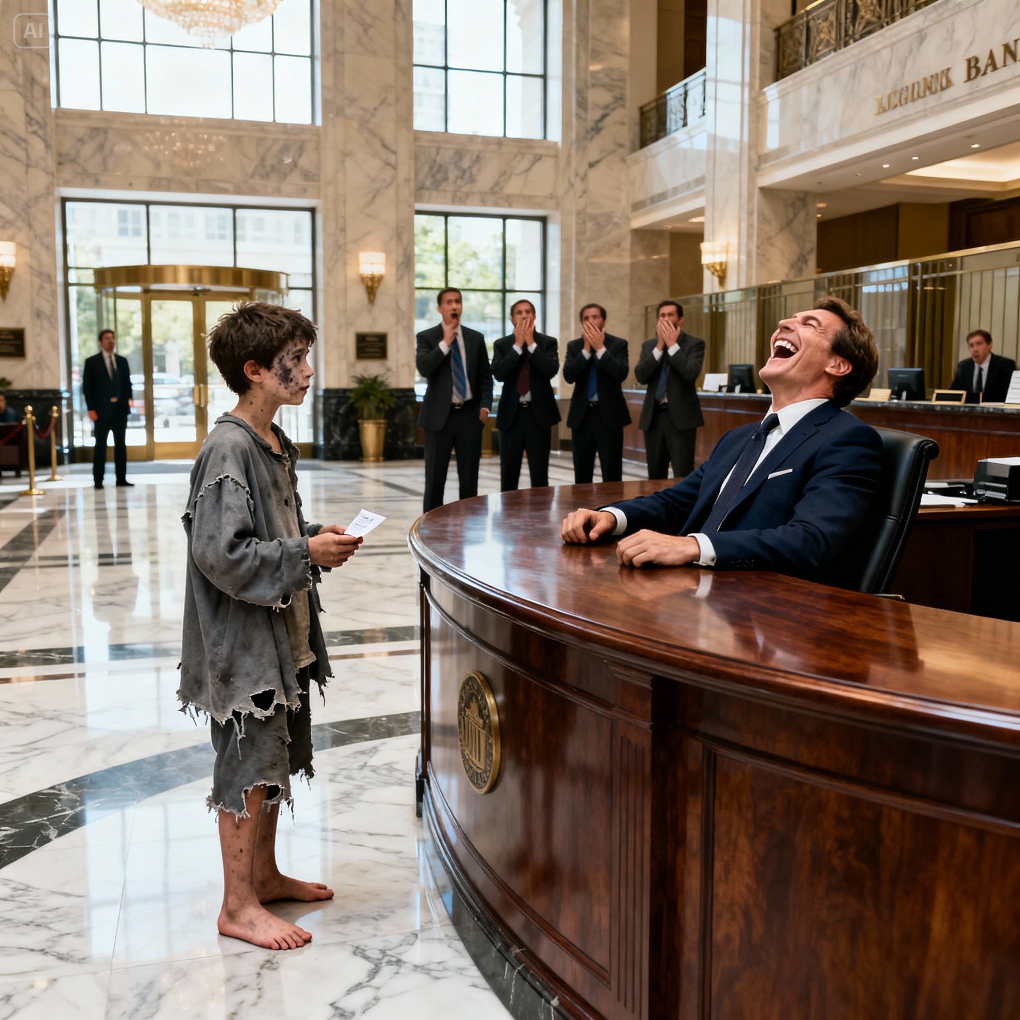 The manager called someone from the bank and disappeared through a side door, taking the documents with him and leaving the boy alone in front of about twenty onlookers who, suddenly, were no longer in such a hurry to laugh.
