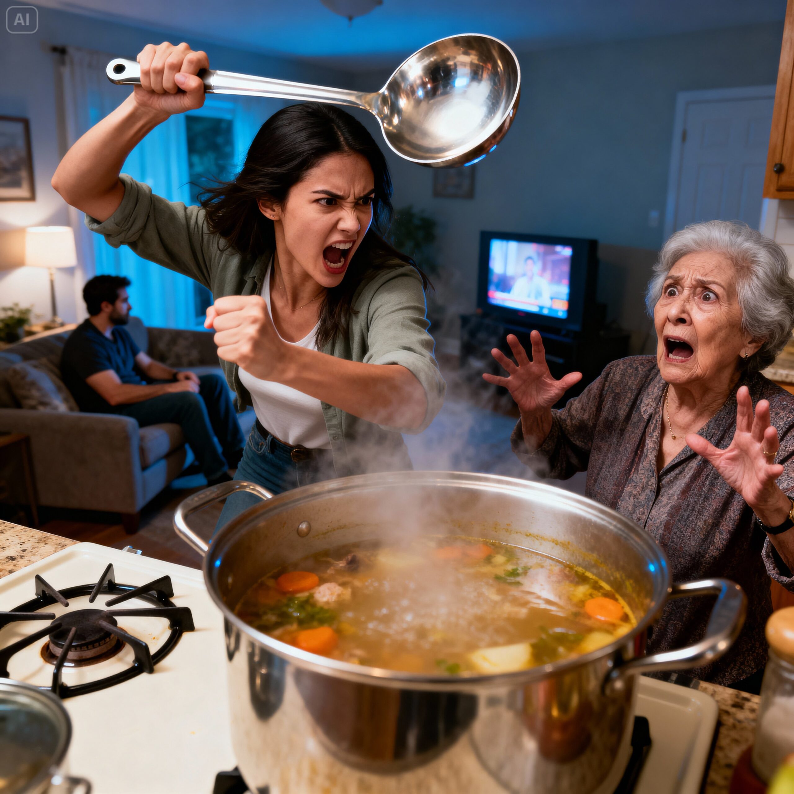 Dawn’s voice wasn’t just a scream; it was a physical assault. I felt the hot metal sear against my skin, followed by the warm, sticky trickle of vegetable broth—and blood—running down my cheek. I stumbled back, gripping the edge of the granite counter, my vision swimming in a pool of sudden, white-hot pain.