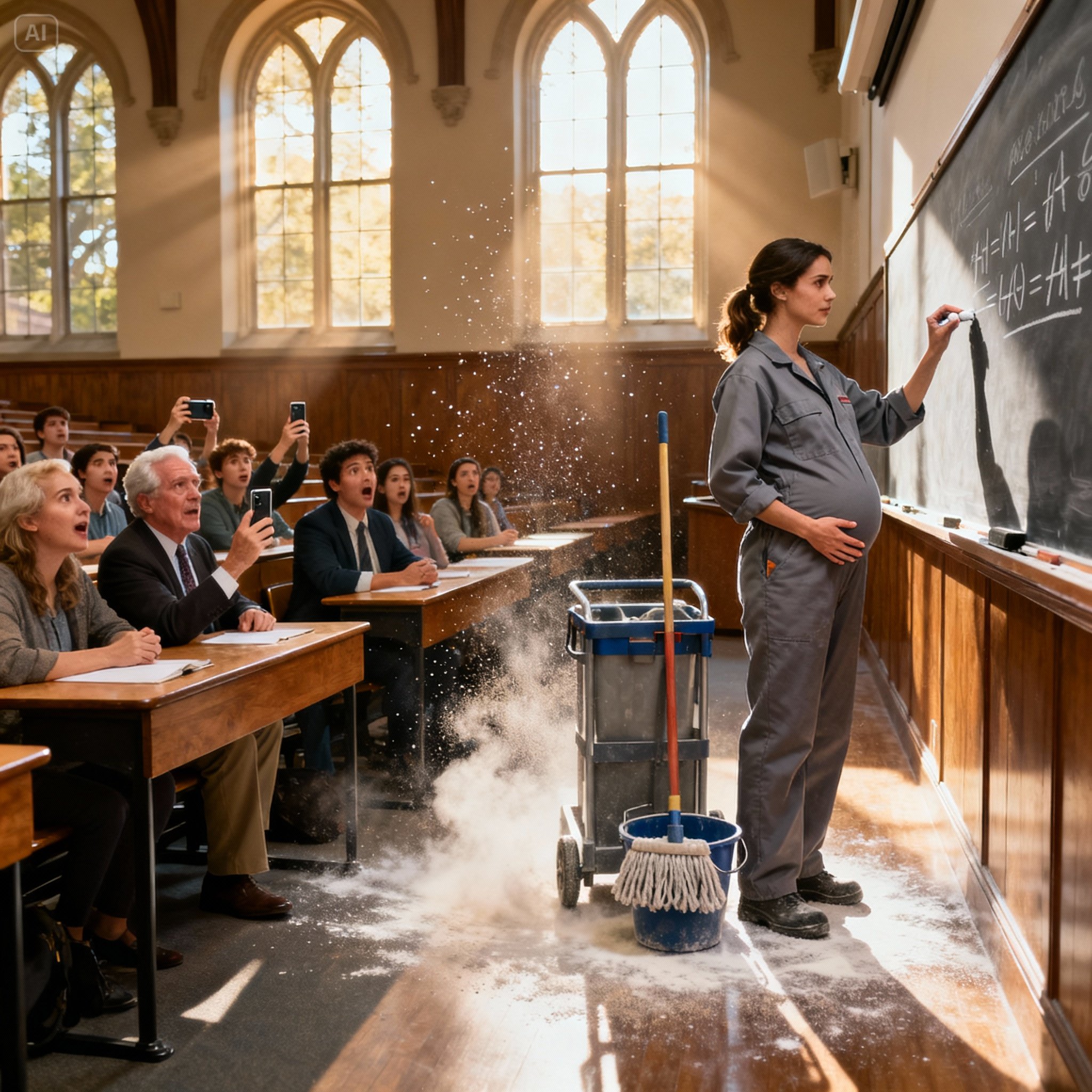 Laughter erupted like small waves. Carmen, who would have preferred to remain invisible, stopped. Humanity sometimes responds in a second: humiliation, pride, memory. She was more than a cleaner that morning; she was an intellect buried by circumstances no one seemed to remember. She looked at the blackboard. The equation was familiar to her. Her hands, accustomed to scrubbing floors, now rested on the cold surface of the chalk that Sebastián held with disdain.