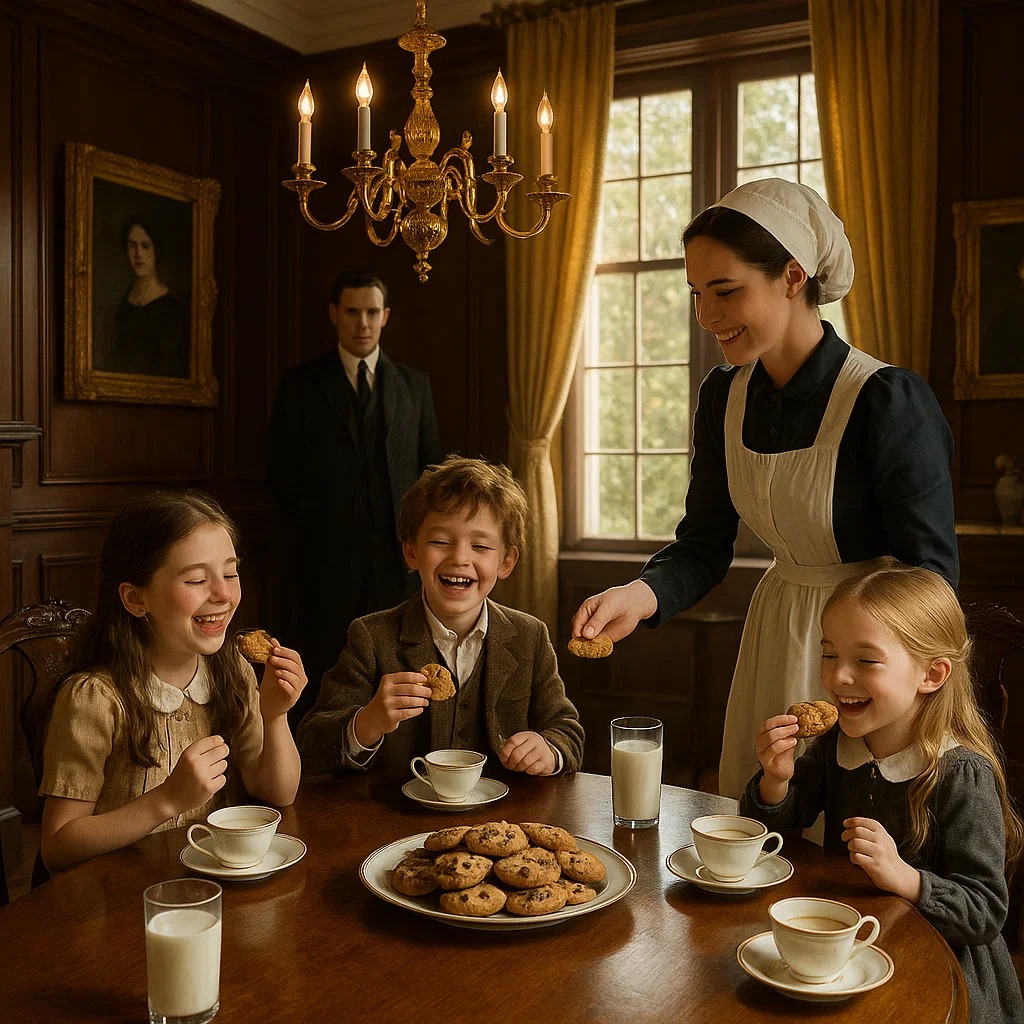 There was Rosa, wearing her emerald green uniform and her hair tucked into her cap. Facing her were Etha and Lily, their faces beaming with happiness. On the table was a freshly baked chocolate cake decorated with icing and cream. Rosa was cutting generous slices while the children clapped their hands in excitement. Etha had her blue shirt flecked with cocoa, and Lily had a smear of cream on her pink dress—evidence that she had helped in the kitchen.