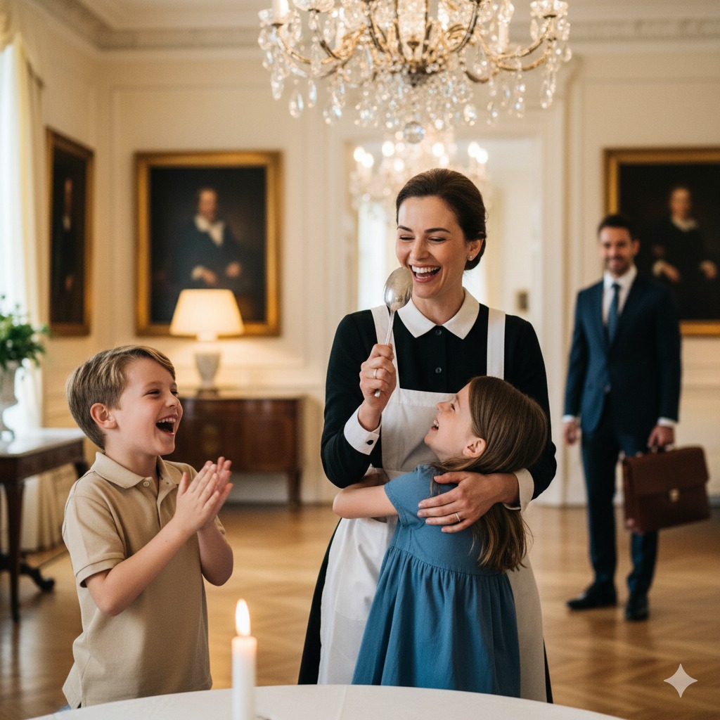 That afternoon, Adrian’s car drove silently up the driveway. The sun was still bathing the mansion’s marble steps in gold. As he entered, he expected to find silence, perhaps the distant murmur of cleaning. But he stopped dead in his tracks: laughter came from the dining room—a real, vibrant laugh, the kind that hadn’t resonated in that house for years.