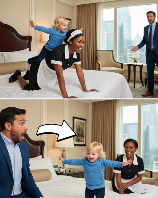 On the white bed sat Amara, the quiet young maid he’d hired only two weeks earlier. Her back was straight, steady, like a living platform. Balanced on her shoulders, giggling so hard she nearly toppled, was Ella—his Ella. The little girl who had never crawled, never stood, never taken a step.