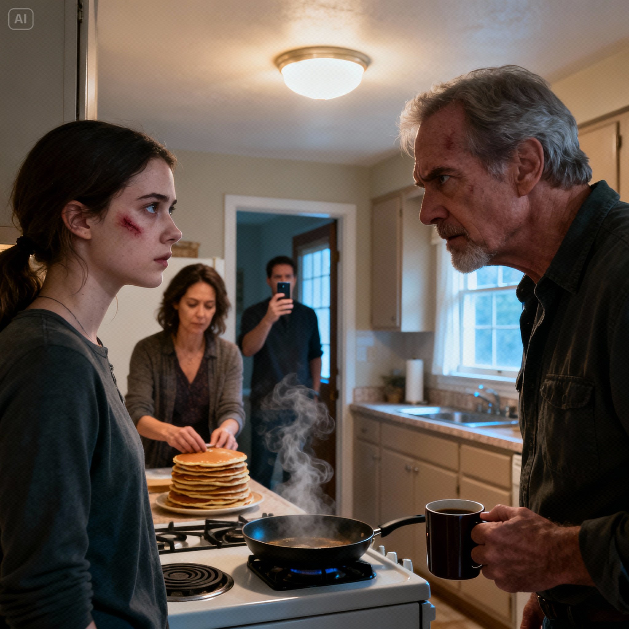 When I stepped into the kitchen, Dad was already there, sipping his coffee like he hadn’t left a mark on my face 12 hours earlier. Mom was at the stove, humming while flipping pancakes, the good kind she never made for me. Only for Kyle. He was at the table, hair a mess, grinning lazily as he forked syrup into his mouth.