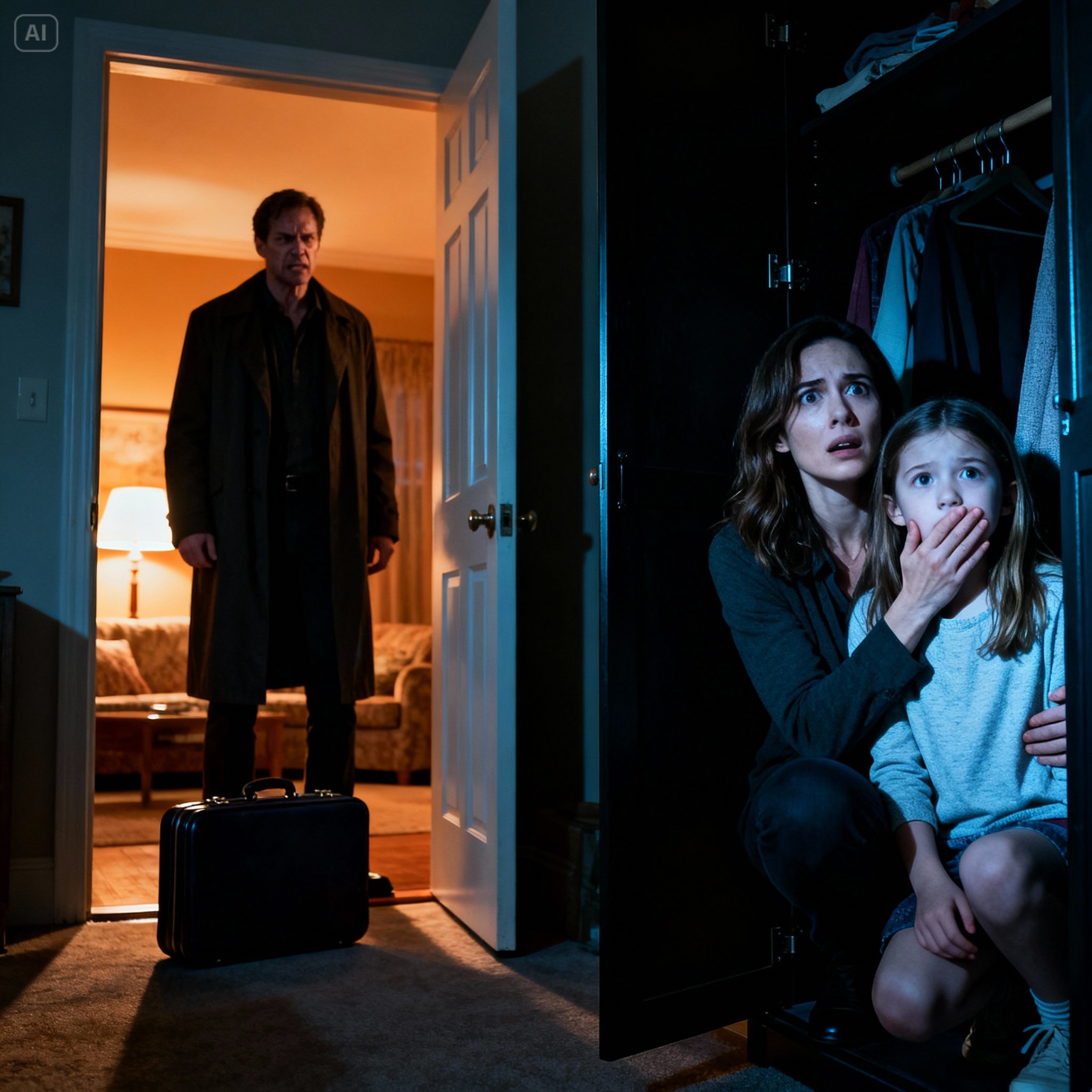 Through the crack in the closet door, I watched the stranger stroll farther into our house like he owned it. He set a small backpack down by the entryway table and glanced around, taking everything in.
