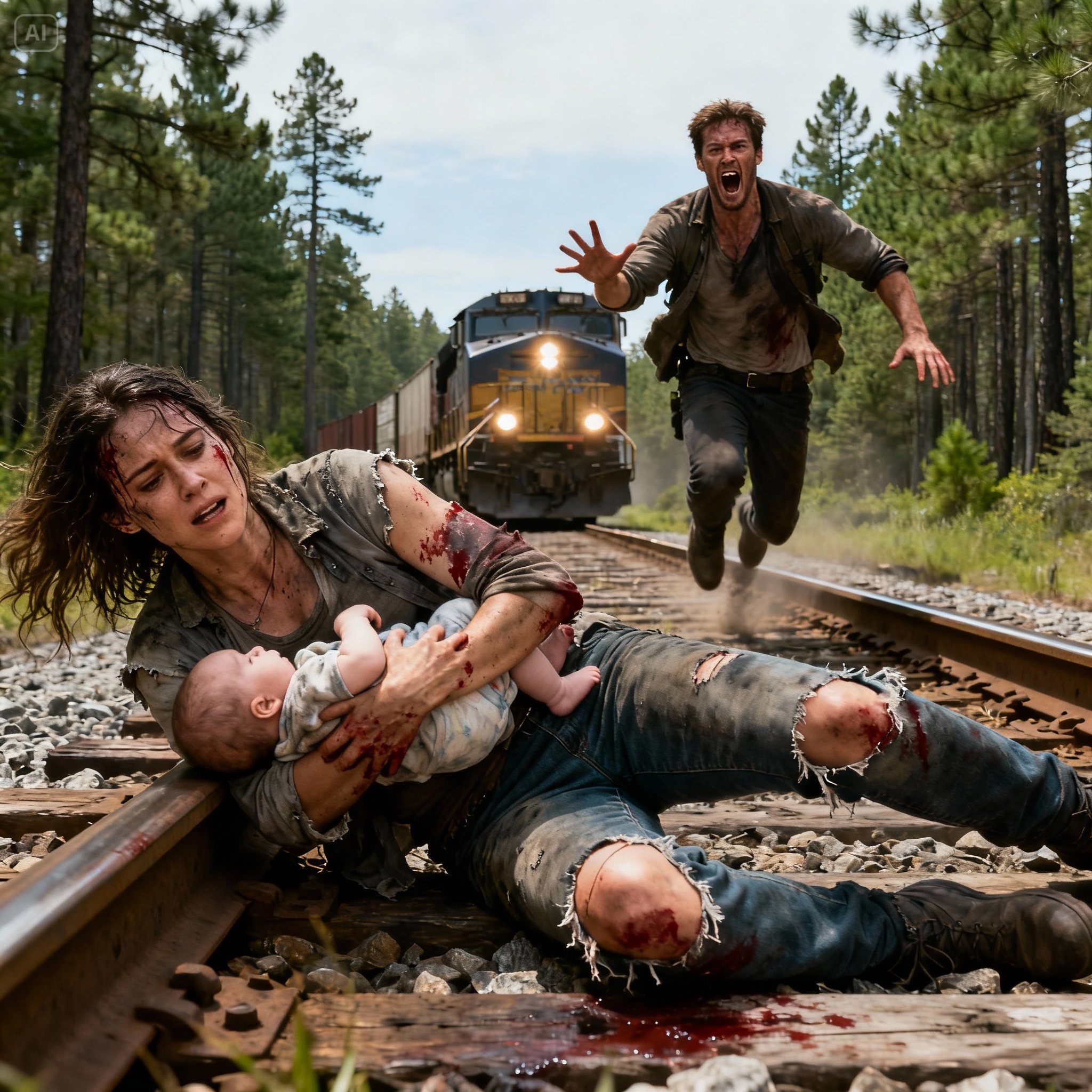 The train’s light grew brighter. Lucas cut the ropes around my wrists, then grabbed my son first, lifting him off the tracks. I screamed for him to run. He shoved the child into the grass and came back for me. My hands were free, but my legs were numb. The sound — metal grinding, thunder, the scream of the locomotive — filled everything.
