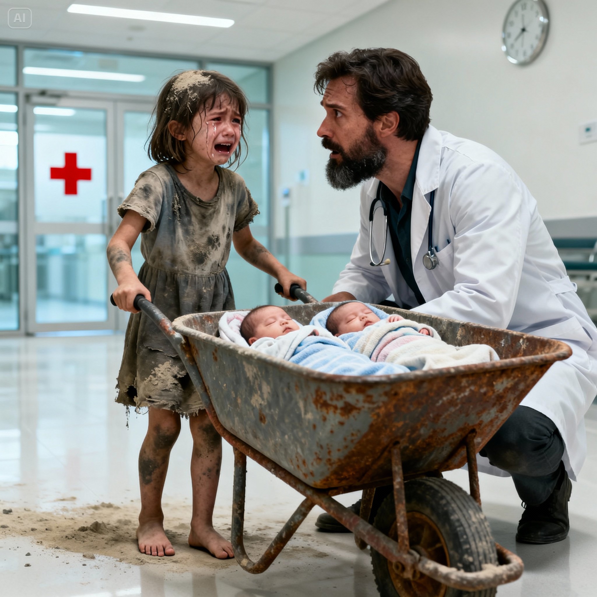 When the automatic doors burst open that morning, the triage nurse froze. A girl — no more than seven — was pushing a rusted wheelbarrow through the doorway. Inside, wrapped in a thin blanket, were two newborns, their faces pale but breathing.