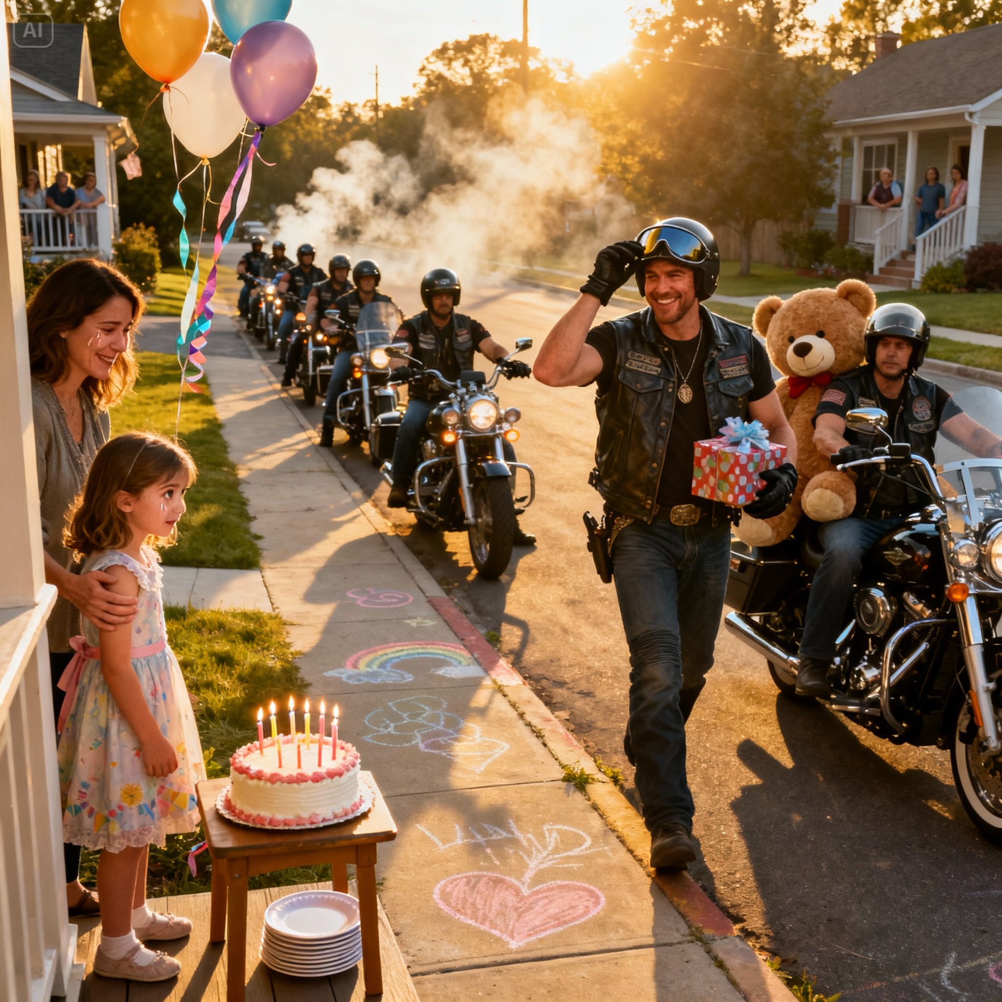 Just as I was about to light the candles so we could at least sing together, the ground began to shake. At first, I thought it was distant construction, but then came the unmistakable roar of engines: deep, synchronized, and growing louder. Emily’s head snapped up. Her eyes widened. A line of motorcycles rounded the corner, their chrome catching the afternoon sun. One after another, they pulled up alongside the sidewalk, forming a protective arc around our small house.