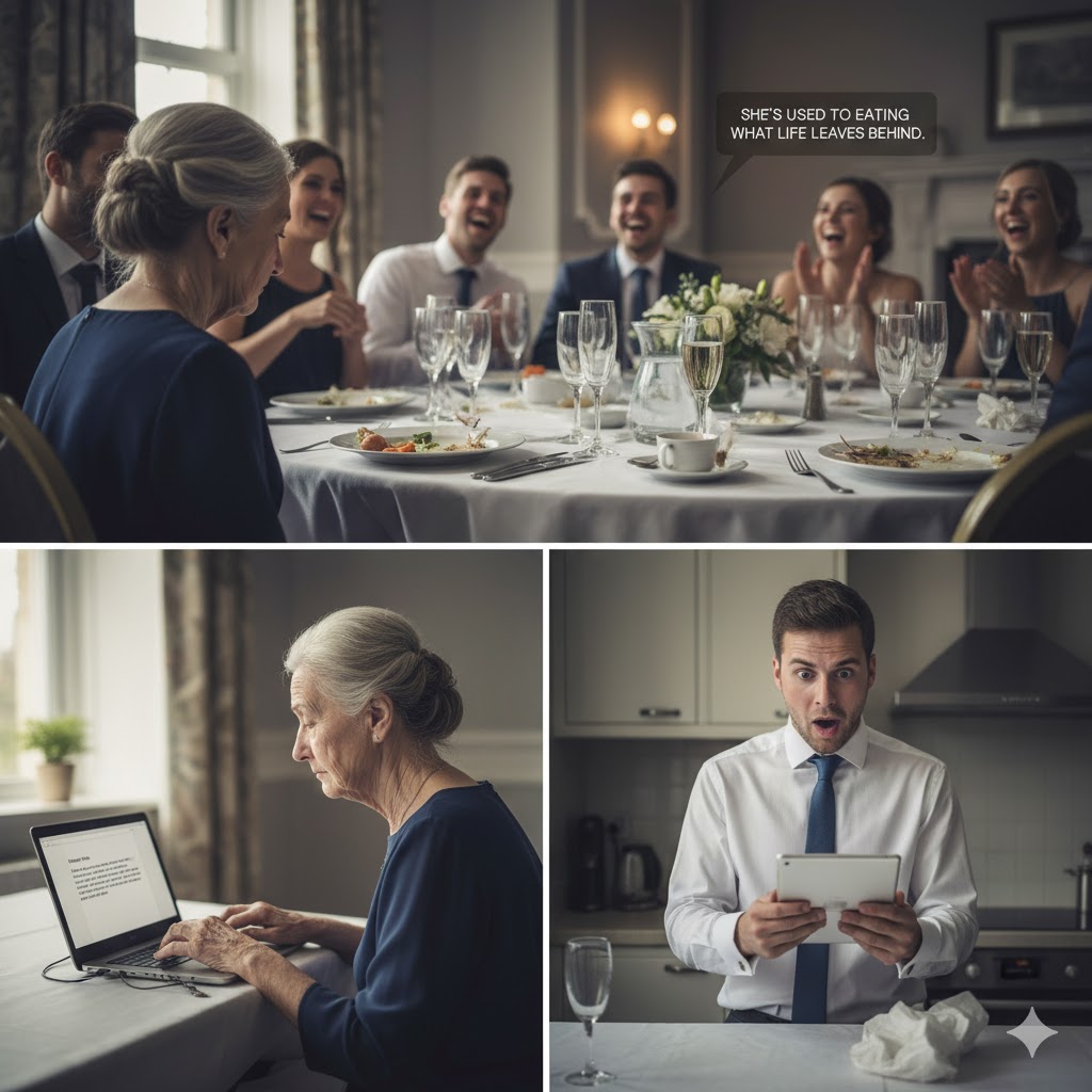 Did you see they finally brought my mom her food? He gestured toward my table with a grin that looked cruel in the soft lighting. She’s used to eating what life leaves behind, so she won’t mind. Barbara laughed. A tinkling sound like breaking glass. Several people at the head table joined in, following her lead.