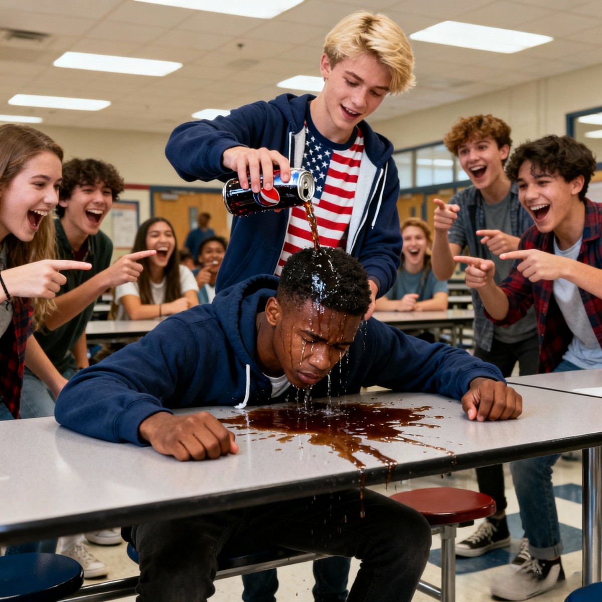 “Didn’t think chocolate melts that fast!” Derek sneered, tossing the empty can aside as the crowd broke into uneasy chuckles. Marcus sat frozen, sticky soda dripping down his neck, his jaw tight. He wanted to stand up, to say something, but he knew exactly how these moments played out. If he reacted, he’d become “the angry Black kid.” So he stayed still. Silent.