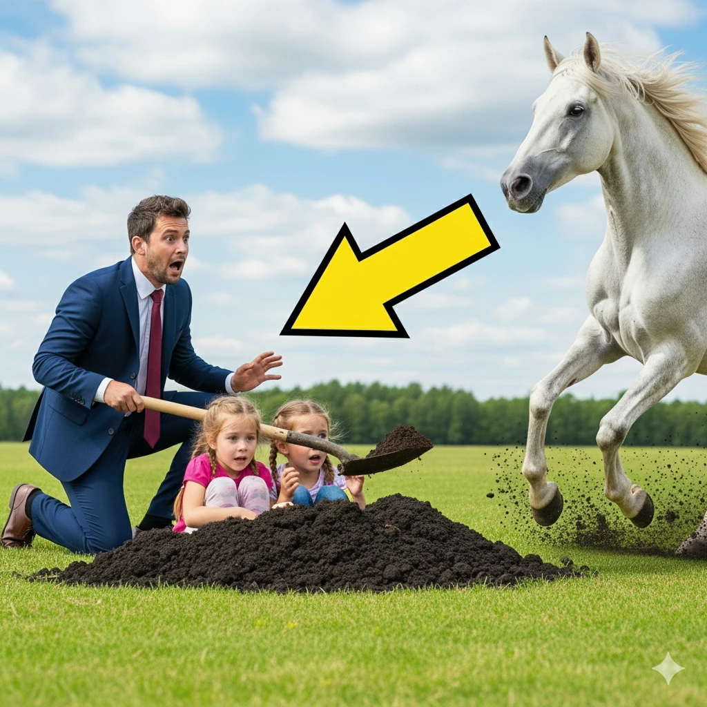 Across the field, a majestic white horse watches the scene with intelligent eyes, sensing that something terrible is happening.