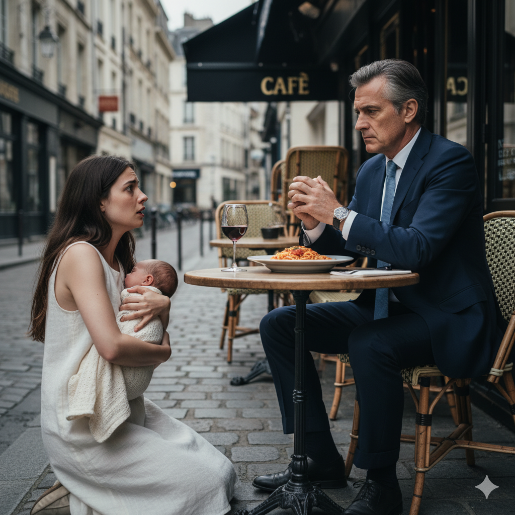 She knelt by their sidewalk table, cradling her baby. “Please, I don’t want your money, just a moment of your time.” The man in the suit looked up from his wine, unaware that his words would shatter everything he thought he knew.