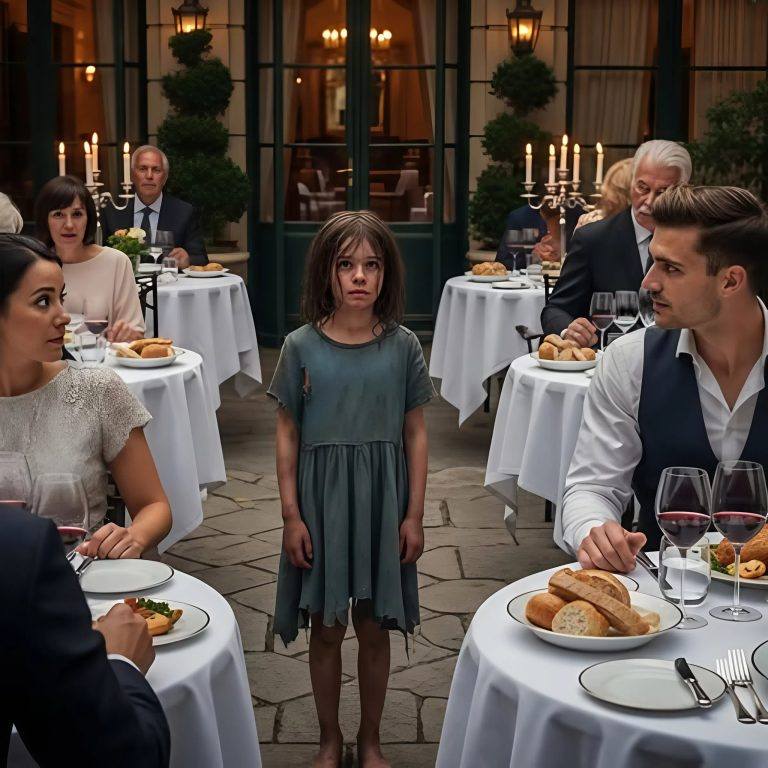 It wasn’t a waiter. It was a child. Barefoot. Probably 11 or 12. Her hoodie was torn, her jeans crusted with old dirt, and her eyes wide with cautious desperation.