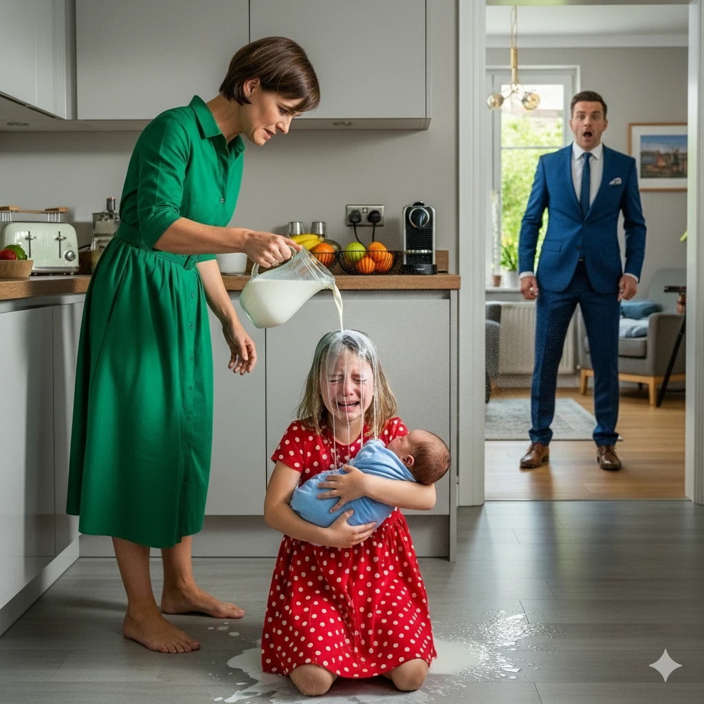 Emily sat on the tiled kitchen floor, her small frame trembling. Milk dripped from her hair and soaked her pink dress, pooling around her knees. In her arms she clutched baby Alex, who whimpered softly, his wide blue eyes filled with confusion.