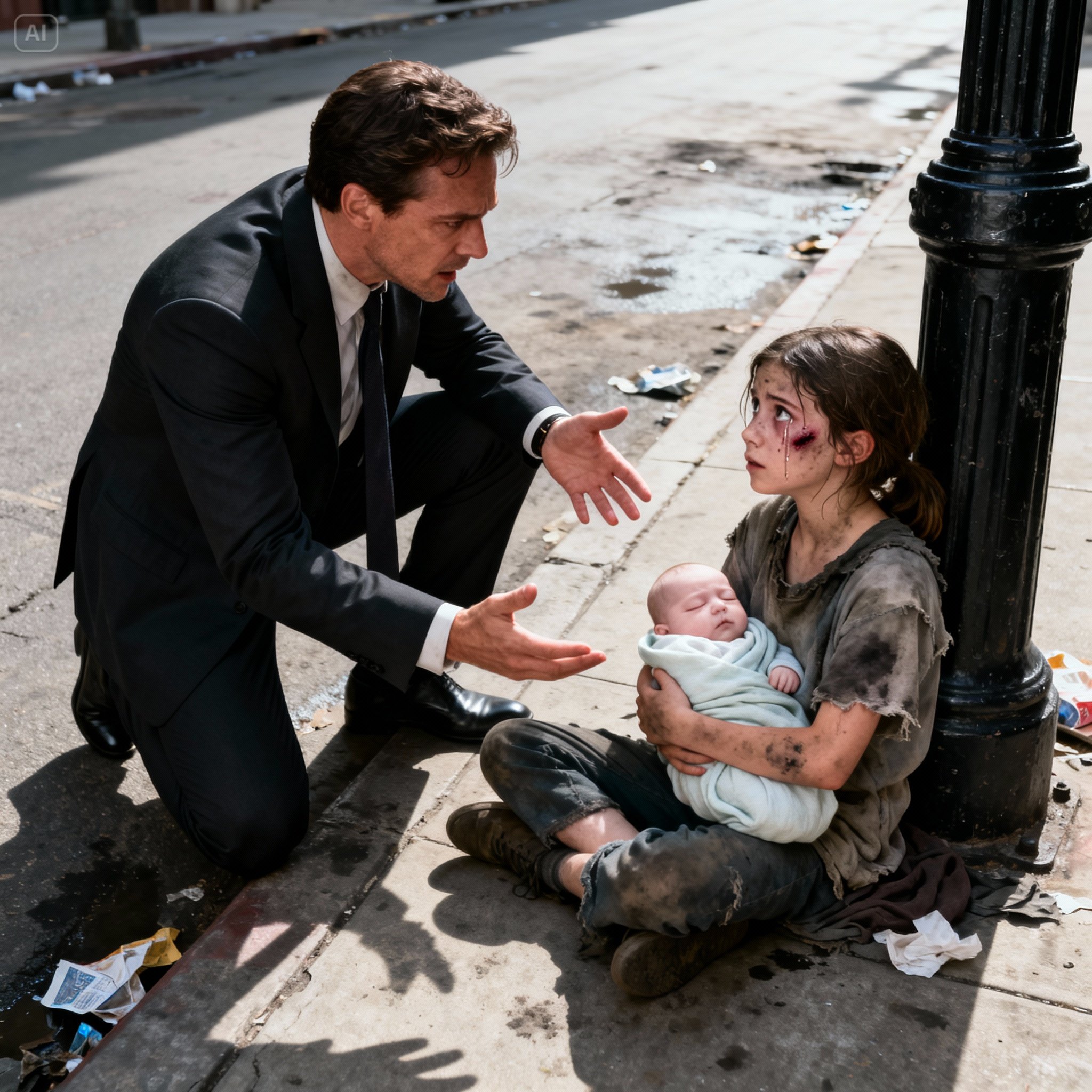 A thin girl in torn clothes collapsed to her knees on the sidewalk, clutching the sleeve of a passing stranger — an older man in an immaculate suit.