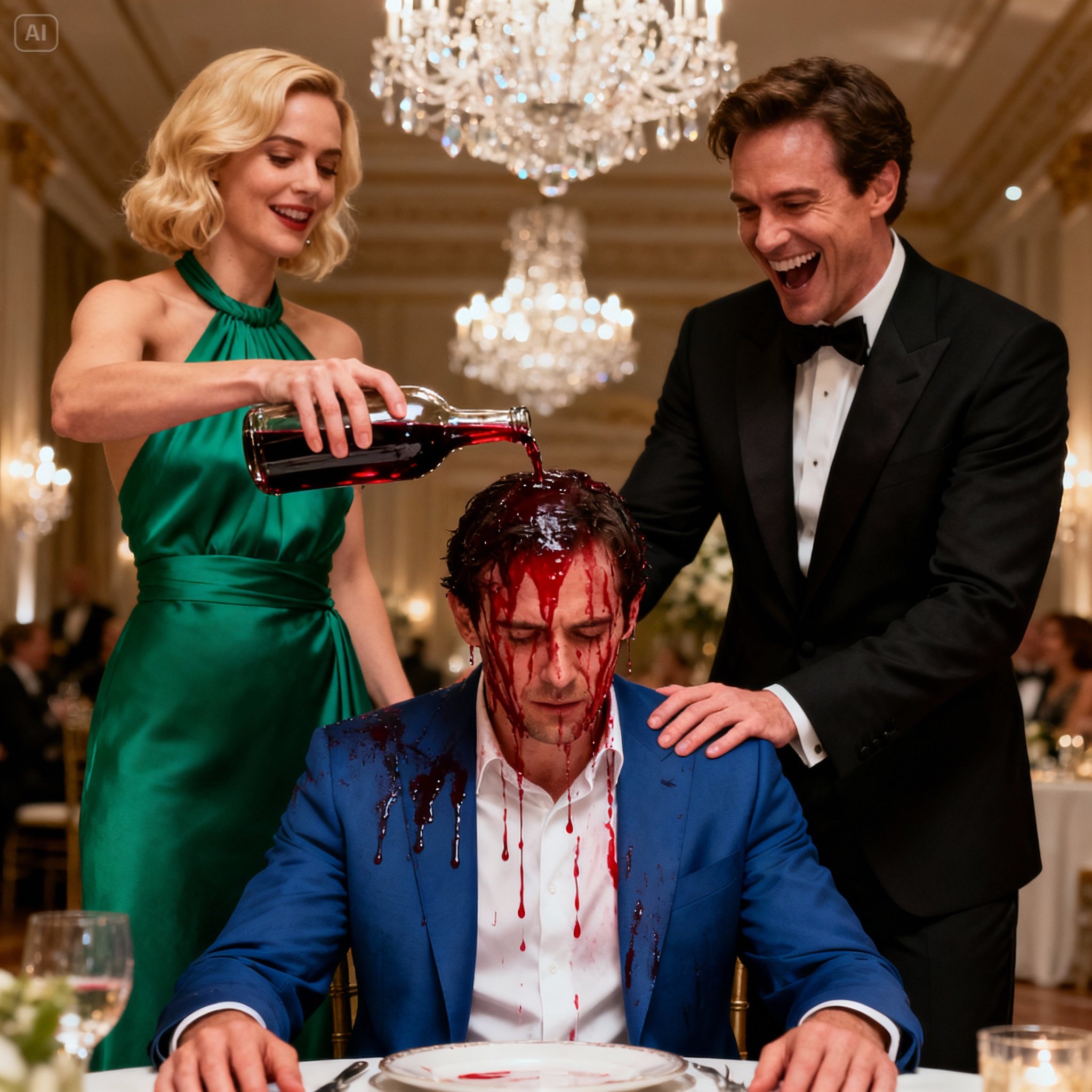 The dark red liquid splashed onto Jamal. It hit his chest, warm and sharp, soaking into the navy fabric, staining the white shirt beneath.