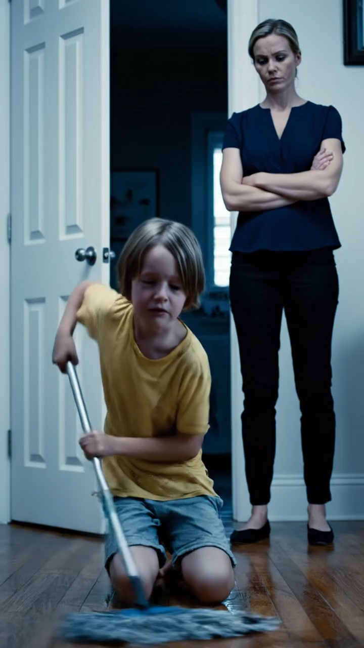 Emily—who should have been playing, drawing, or resting—was kneeling painfully on the cold tile floor, diligently scrubbing at the grout with a worn brush. She was tired, trembling faintly, and had small, raw scratches on her hands where the rough chemicals and hard scrubbing had abraded her skin.