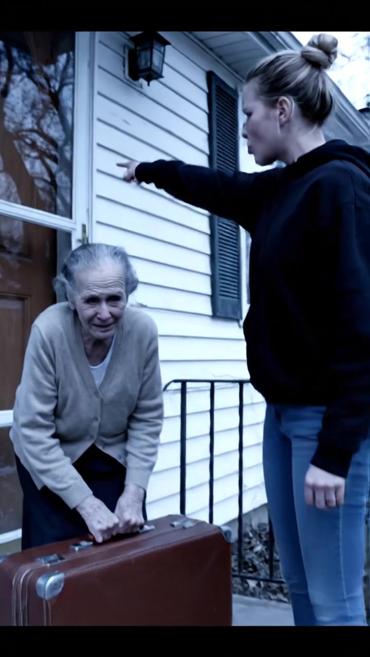 The heavy oak door slammed shut behind her. The cold street was instantly silent, lined with neon lights flickering against the puddles from the evening rain. Cars rushed past, drivers barely glancing at the frail old woman standing at the curb with nothing but a small suitcase and a heart fractured by betrayal. She found a hard, cold bench at the bus stop and sat quietly, pulling her thin coat close to her fragile frame. Strangers walked by, some sparing her a sympathetic glance, most ignoring her completely.