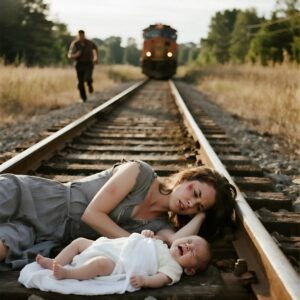 A young woman was tied to the tracks , her wrists bound with thick rope and her ankles chained to the steel rail. Her torn dress clung to her bruised skin, and her long brown hair was matted with dirt and sweat. But what turned Noah’s stomach was the tiny baby she clutched to her chest, wrapped in a tattered blanket, crying weakly.