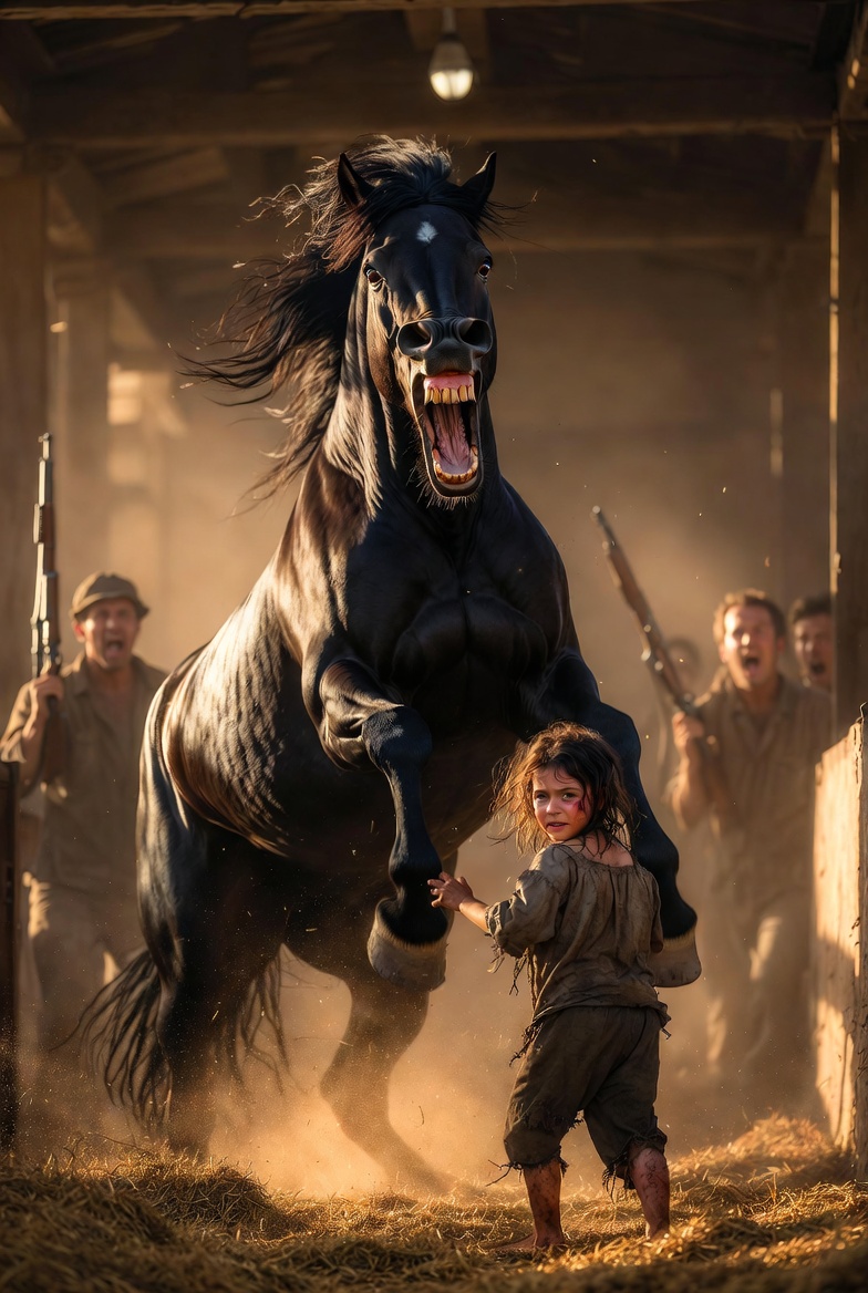 The girl was still there, standing beside the black stallion. Her small hand rested on the animal’s neck. The horse, the same one that had sent two men to the hospital, had its eyes closed. It was breathing slowly. Deeply.