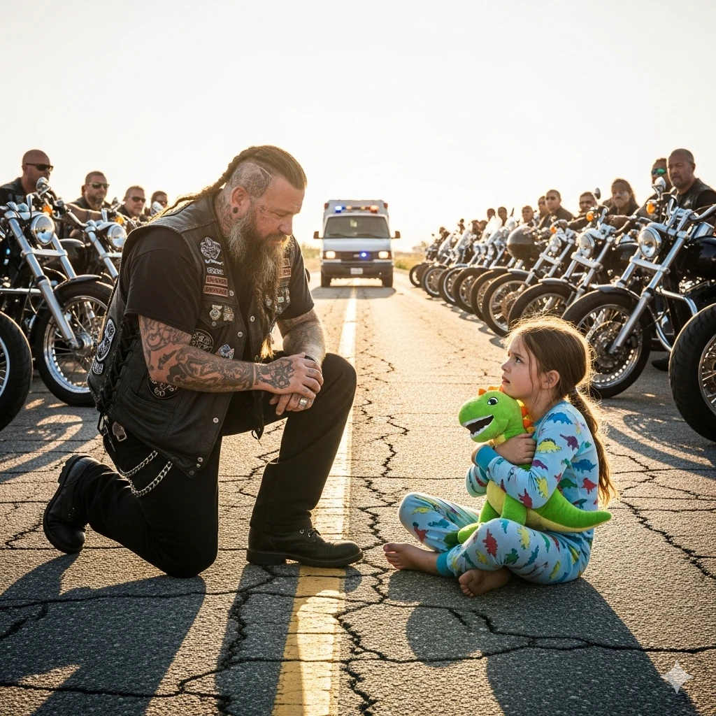 Fifty bikers formed a circle around Emma, engines revving like a heartbeat. Leather and chrome became a fortress. She sat on Tom’s bike, clutching the handlebars, her dragon toy tucked tight against her chest.