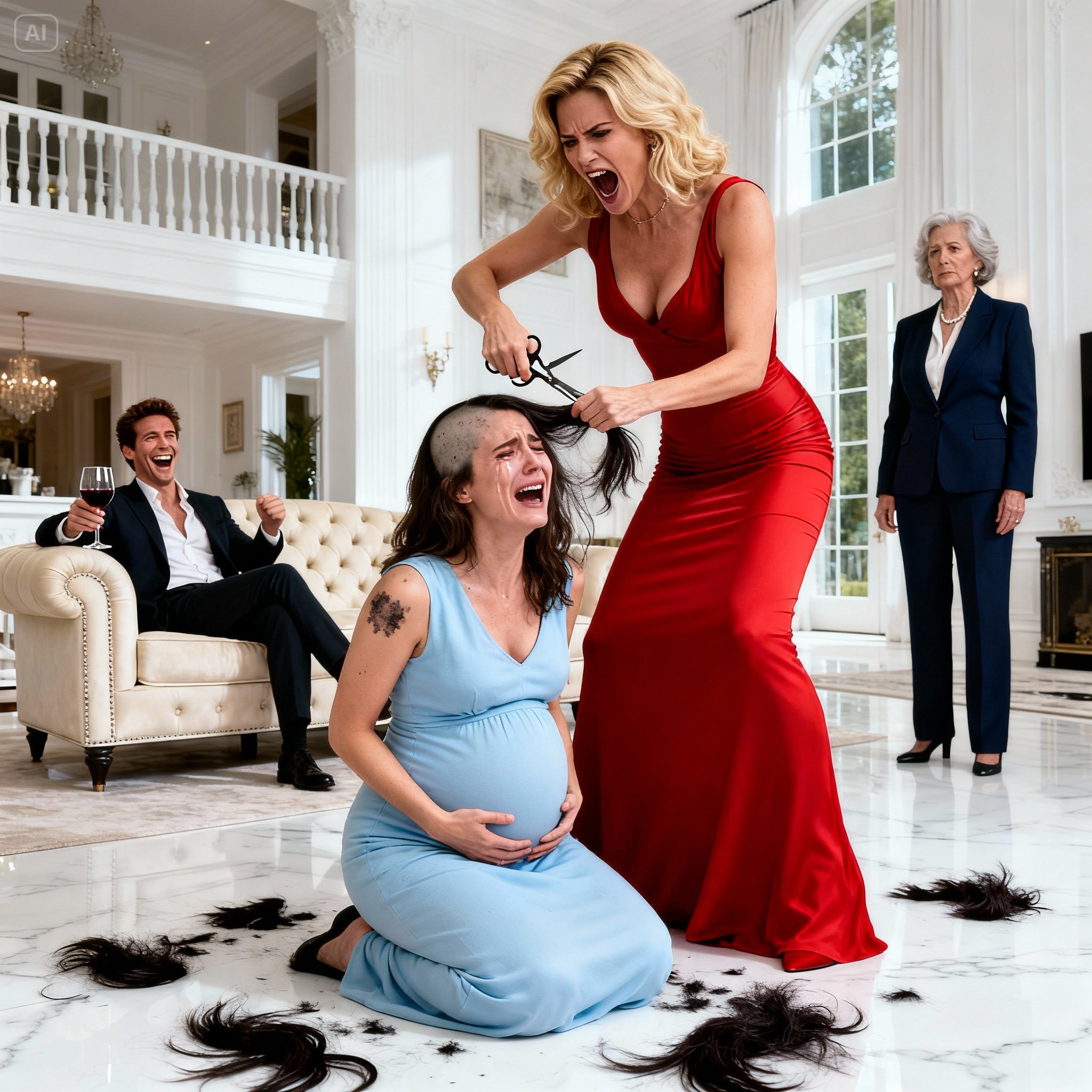 When I saw my husband, Daniel , and his lover, Clara , cutting the hair of Laura , my daughter-in-law who was seven months pregnant, I felt something tear inside me. The scene unfolded in our backyard, a place that had always been a symbol of family tranquility, now transformed into a cruel scene. Laura wept, clutching her belly as she pleaded,