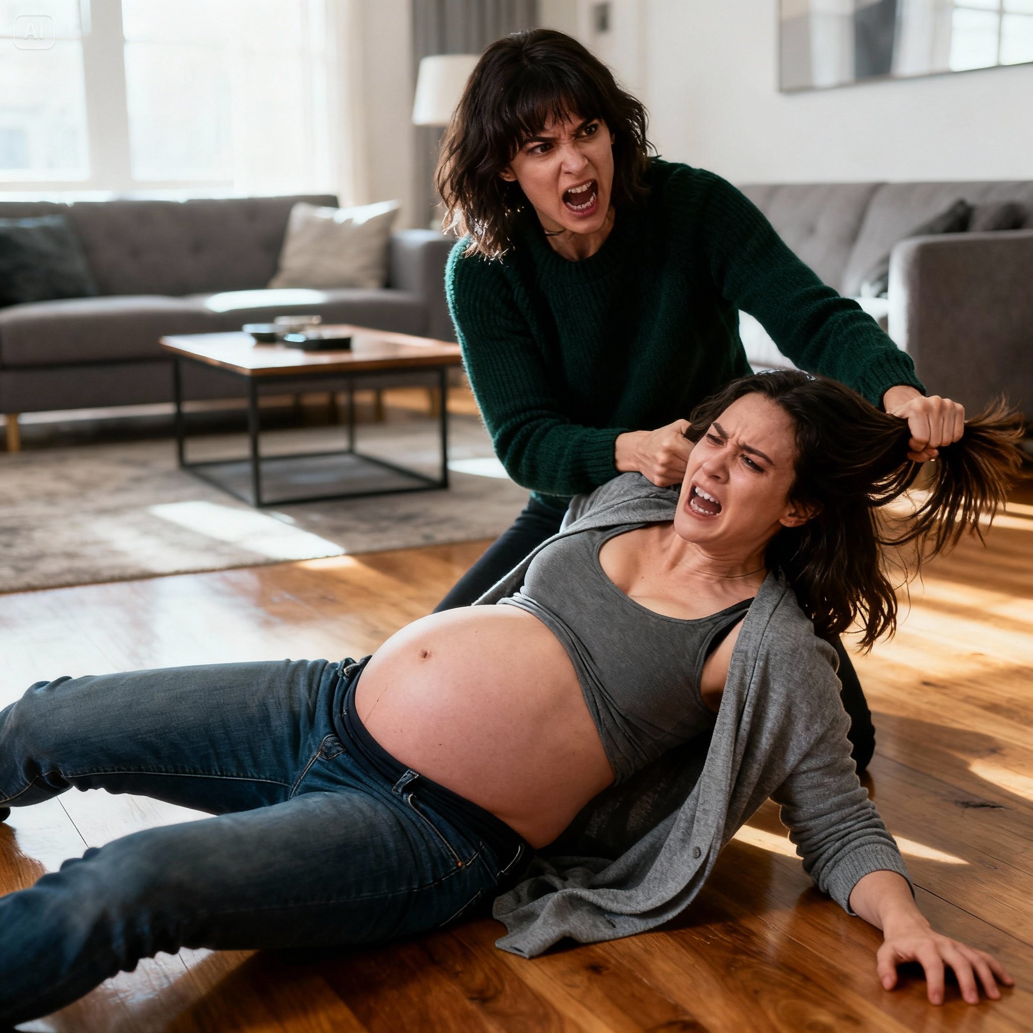 Her expression changed completely. Her breathing became ragged, and before I could react, she lunged at me. Her fist slammed brutally into my stomach, a sharp blow that knocked the wind out of me. I felt a stabbing pain shoot through my body, my legs trembled, and suddenly I felt a warm, wet sensation running down my legs: my water had broken.