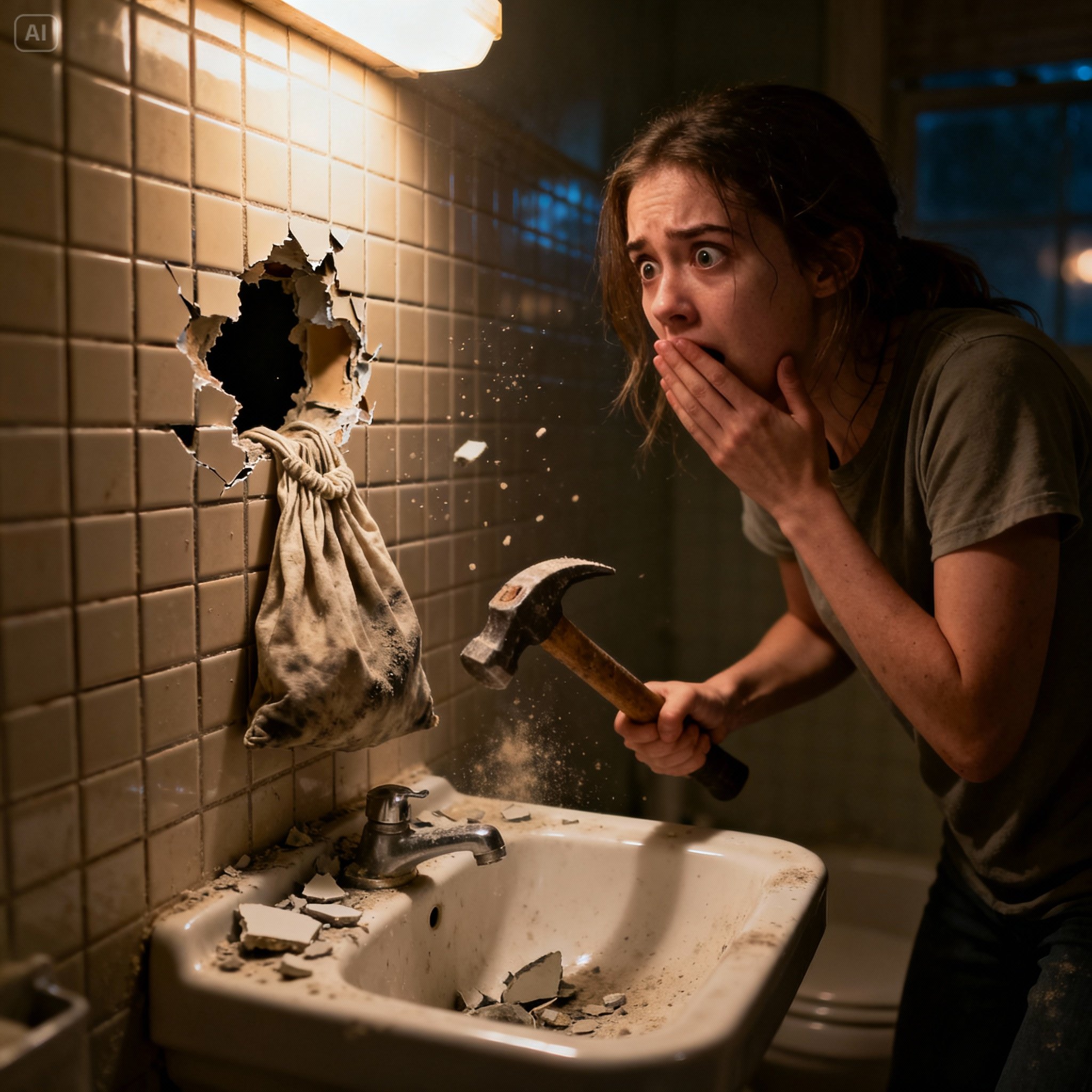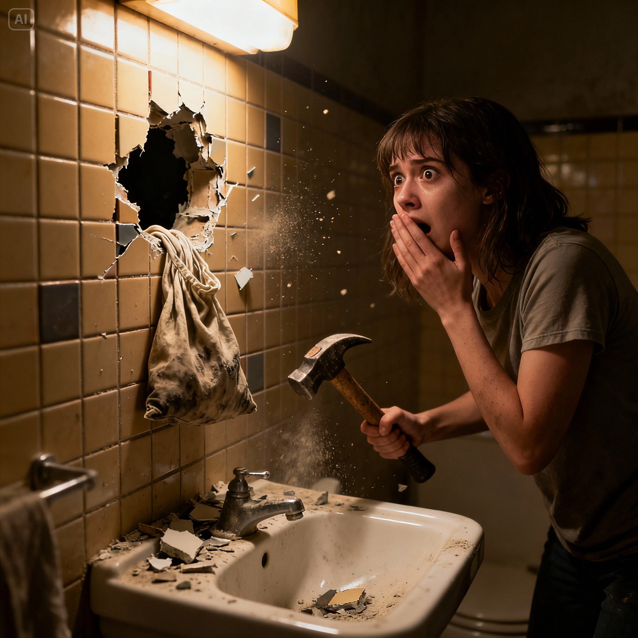 But my hands lifted the hammer on their own. The first strike was soft — the tile just cracked. The second — louder, a piece fell off, hitting the tile floor with a hollow thud. I held my breath and shone my flashlight.