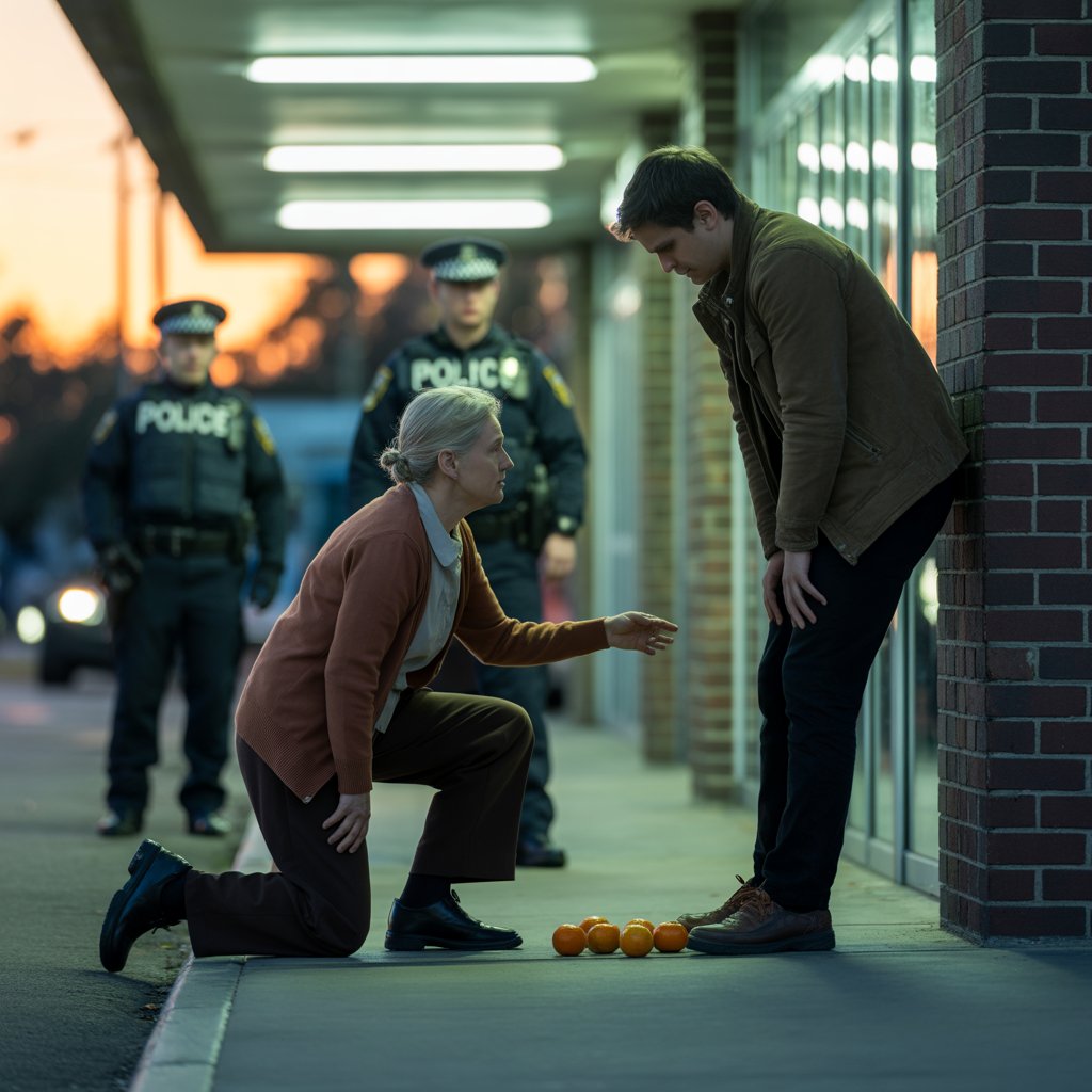 The supermarket security guard ran toward the teenager who was running away with a backpack. He caught up with him near the parking lot and pushed him against the wall. Some tangerines rolled onto the floor.
